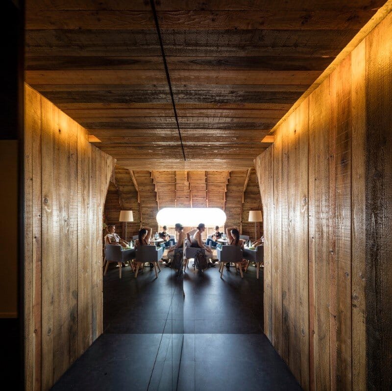 The building is the result of a regenerative transformation and expansion of a small pre-existing structure that had been abandoned for many years. The walls, roof and door frames have been restored, preserving the essential features of the original construction. The interiors were redesigned, shaped to their new roles (e.g. restaurant), and made compatible with current legal requirements.