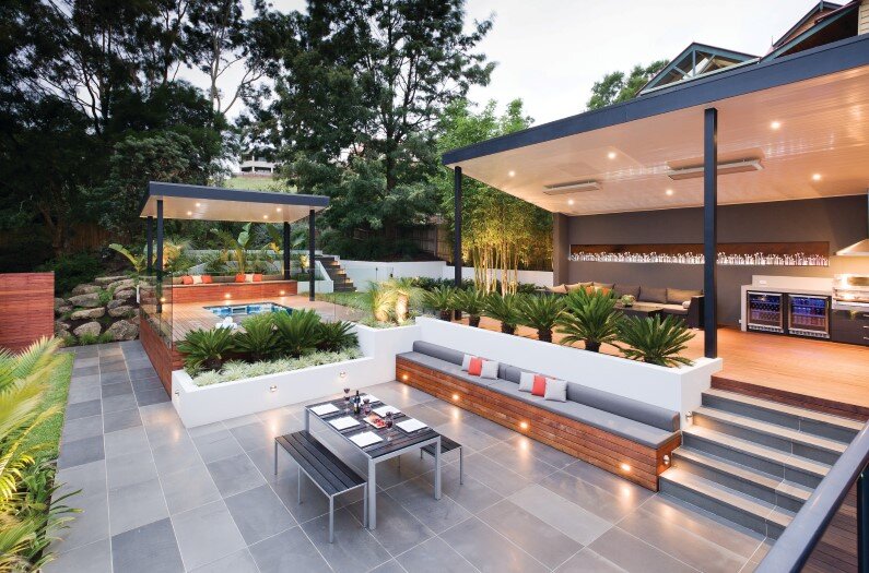 The architect’s description: An impeccable outdoor entertainment is showcased here, in a stunning display of resort style living. Constructed by Apex Landscapes, it features three separate areas which each fulfil a specific purpose. Due to steep grades in the land, the areas were designed precariously with innovation at the forefront of the initiative. Linked to the home via a boardwalk, guests are greeted with the outlook of a place that could effortlessly facilitate some of the most relaxing and enjoyable moments you could imagine having in your own home.
