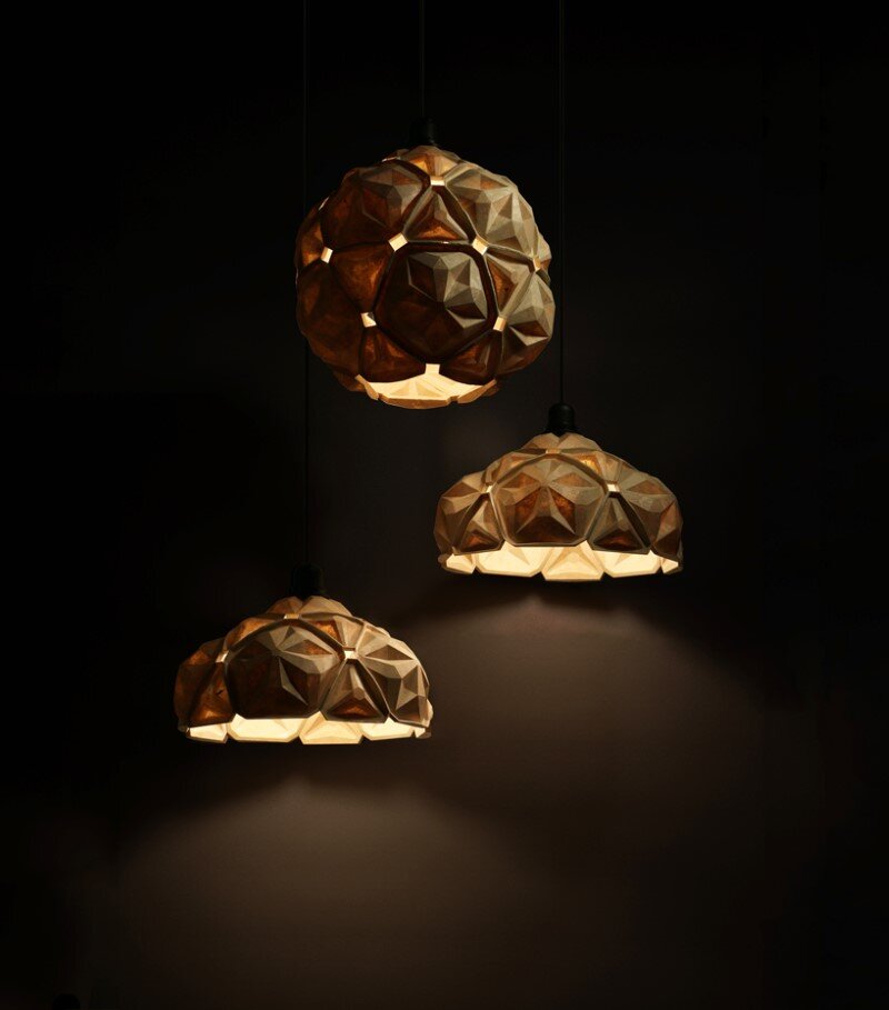 A pendant is one of my priorities due to the fact that after the material has been processed by Hi-pressure vacuum, its fiber structure becomes solid and rigid, yet having lightweight with very interesting translucence effect. The pentagon does not only represent a strong structure, but also reflects a shape of cassava leaf as well, which has become my inspiration. The dim and warm white light of “Penta” presents tropical aesthetics mood and tone and the texture shows an authentic touch and feel.