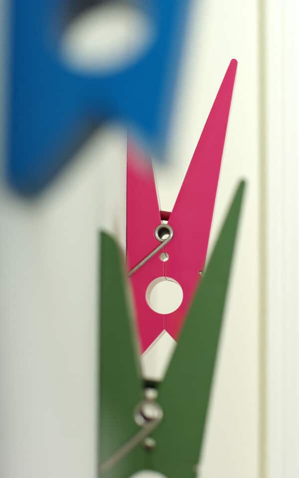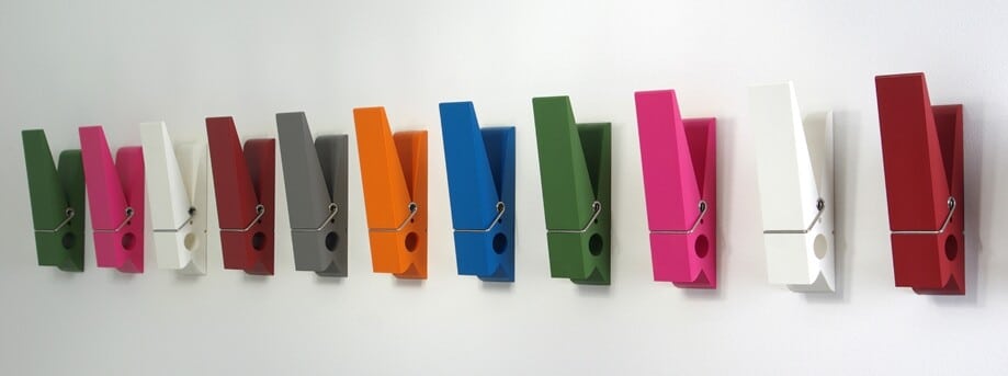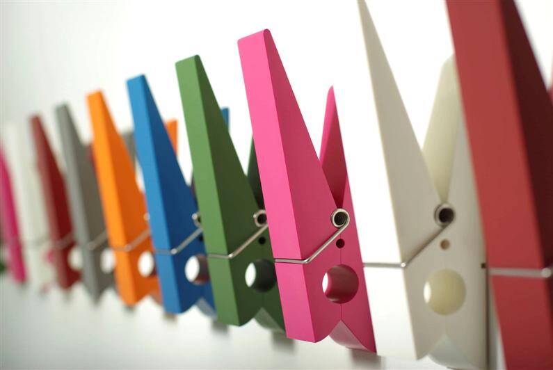 The set of hooks contains 7 colors and can be mounted on the wall, anywhere in the house, giving a touch of originality. They also keep their gripping function so that things can be hung on them and pinned, like laundry. You can hang your bag, hat, jacket, umbrella or they can be used in the bathroom to hang or pin towels. They can also be attached on the outside walls, outside the house, as they are water resistant and are not affected by moisture. These pins are made of polycarbonate and the spring is made of stainless steel. The loading weight of the Pince Alors ! hooks is of 3 kg.