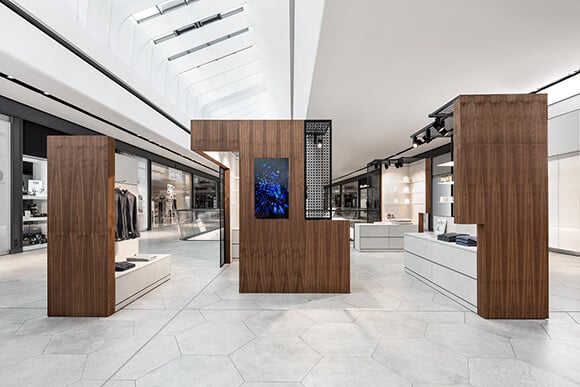 The design is twofold: It blends in with the architecture of the host space and meets the requirements of a wide range of presentation contents. Precious walnut finishes speak of quality and naturalness. The shade of brown contrasts with the natural stone tiles of the surroundings and the inner surfaces of the box. The bright concrete surfaces speak for themselves; they are modern and at the same time sufficiently restrained not to overshadow the products. The black perforated plate takes up the corporate logo.