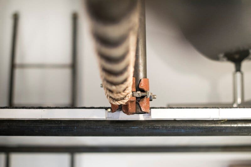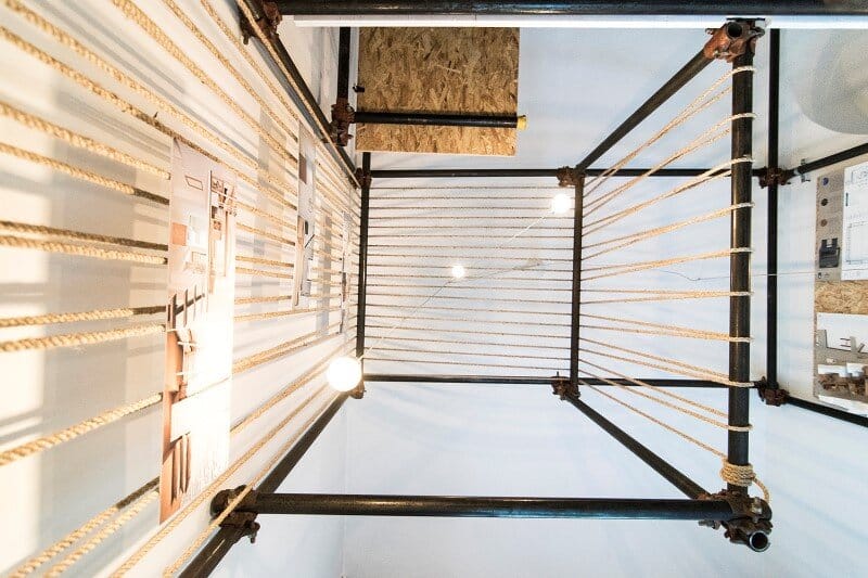 The first part of internal structure is dedicated to projects. Pinned to the curtain ropes drafts are illuminated by three light bulbs, which identify an exhibitional space. On the opposite side, there’s current projects area, held to large OSB panel, together with working tools and sketches.