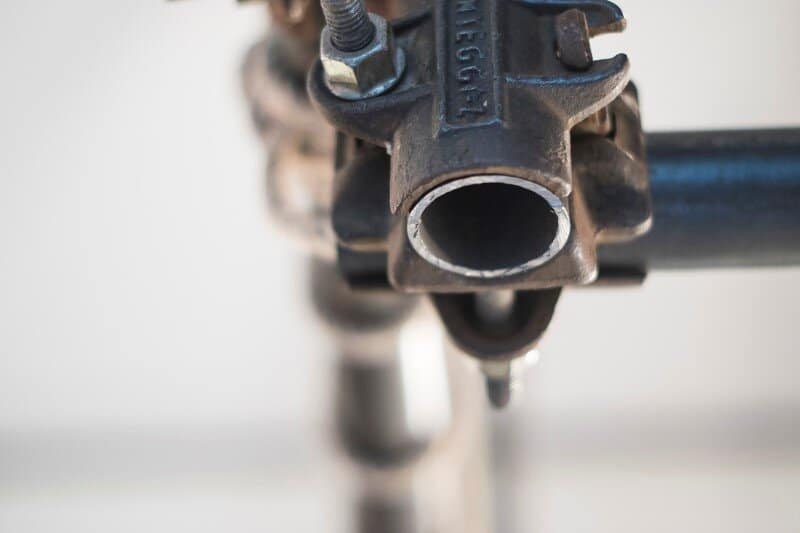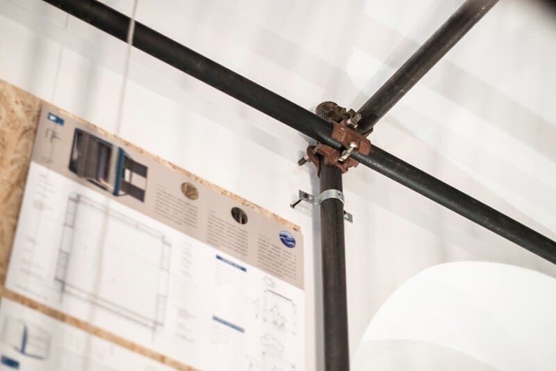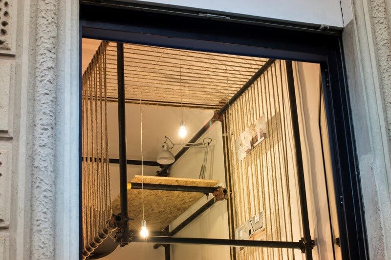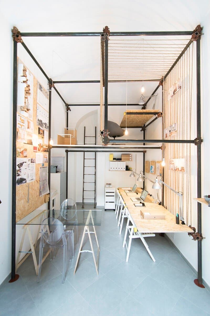 Description by R2architetti: Taking to account its limited size, we work in sections, where the workspace is articulated with scaffolding pipe structure. This solution not only gives support to tables and the mezzanine but redefines the space through a sequence of portals, maximizing the potential of the whole volume.