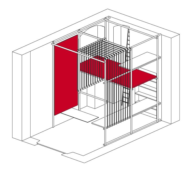 Cantilevers the tables are supported with, allow to liberate underlying space. The individual working sections are emblemed with lamps. The mezzanine is intended to be a space for constructing maquettes. It is accessible through the ladder, located in a wall niche. The meetings and the reception take place on a glass plate, just next to the ongoing projects.