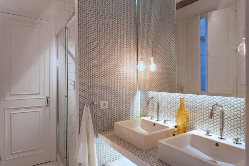 The en suite bathroom has a comfortable bath and is decorated with different shapes of white tiles and yellow accessories. All the three bathrooms are equipped with double sinks and large rain showers. Visit Nobohome