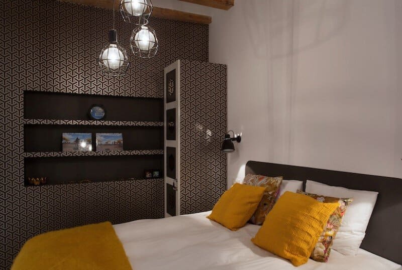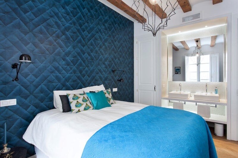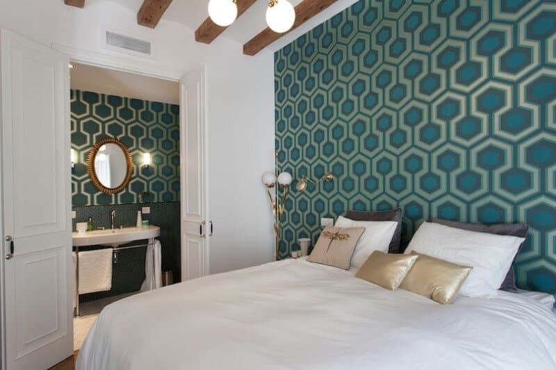 The Mediterranean bedroom has pleated turquoise wallpaper and greenish blue accessories. The Nature bedroom has green hexagonal wallpaper and the en suite bathroom has little green mosaic tiles. The third bedroom is based on Manhattan and it features a geometric wallpaper and other recognizable styles from the big Apple.