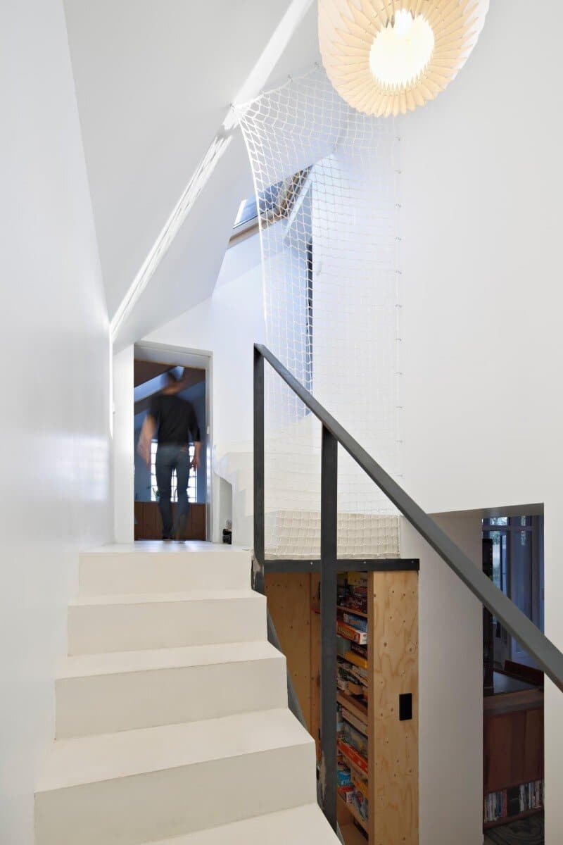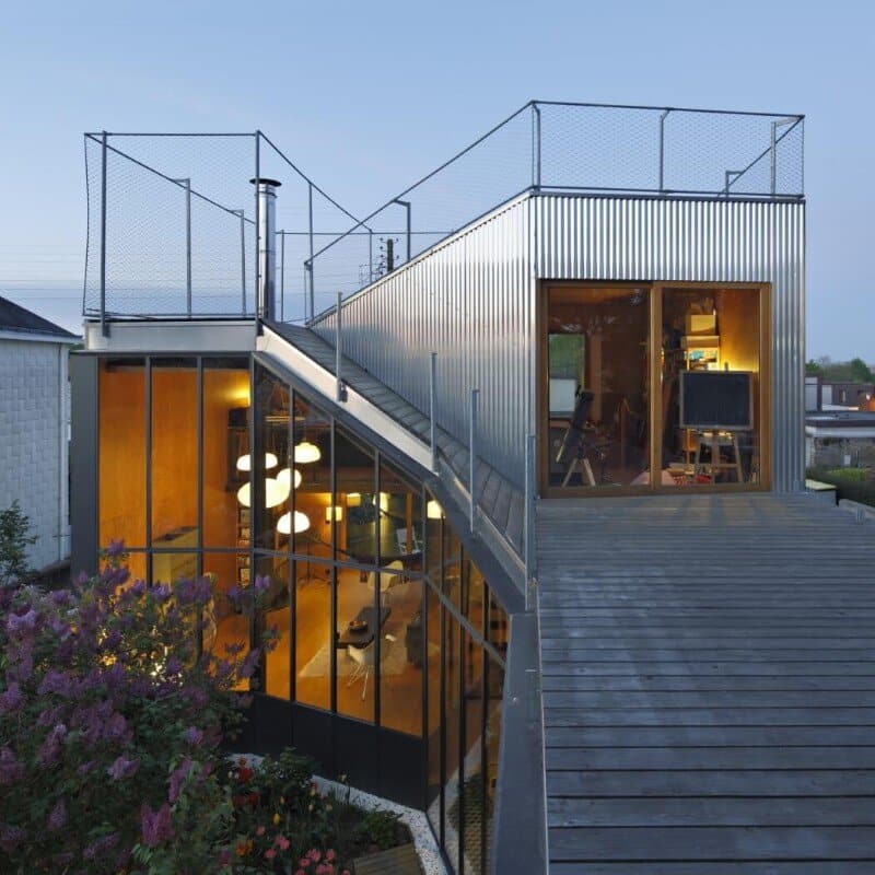 We designed a path created from a play with successive terraces connected by ramps, forming an itinerary which opens successively to a patio, to the landscape of the heart of block’s small urban gardens and the great scenery on the southern shores of the Loire. The development of this path defines a surface. The volume situated bellow this surface forms the extension of the house, a series of living spaces (living room, kitchen, workshop) connected by oblique views, put in relation through a play with the levels, without any interior door.