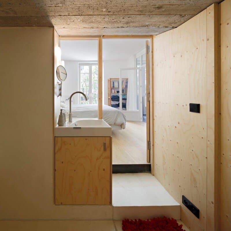 The relationship with the landscape is twofold: the house is not only a potential of various links with the exterior, but the work with the material is the creation of an interior landscape. The graining of the plywood, the motifs drawn by the rain on the metallic structure during construction, the moiré effect of the resin or the repetitive pattern of the cement tiles create a separate universe, the same way as the clouds draw unexpected landscapes inviting to contemplation.
