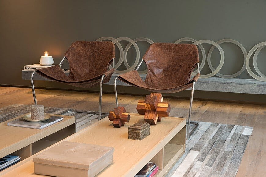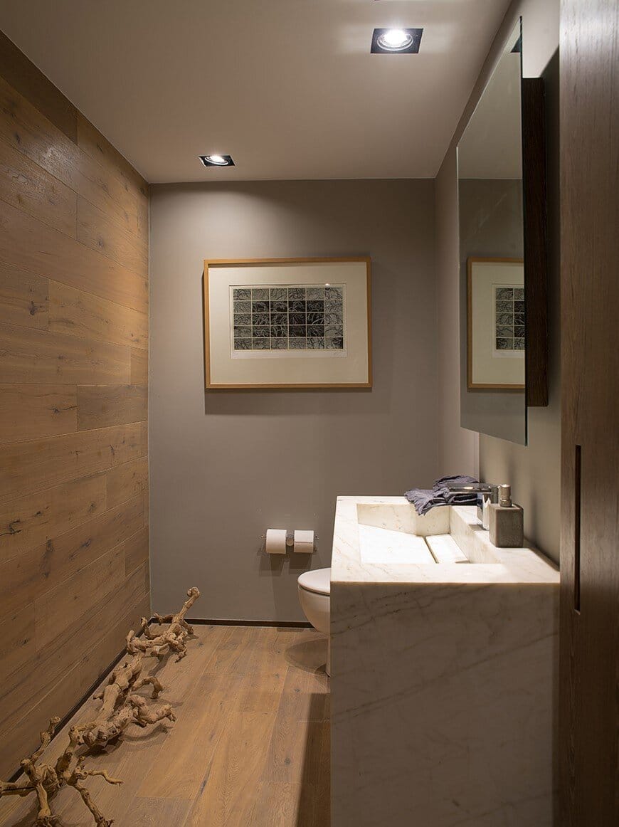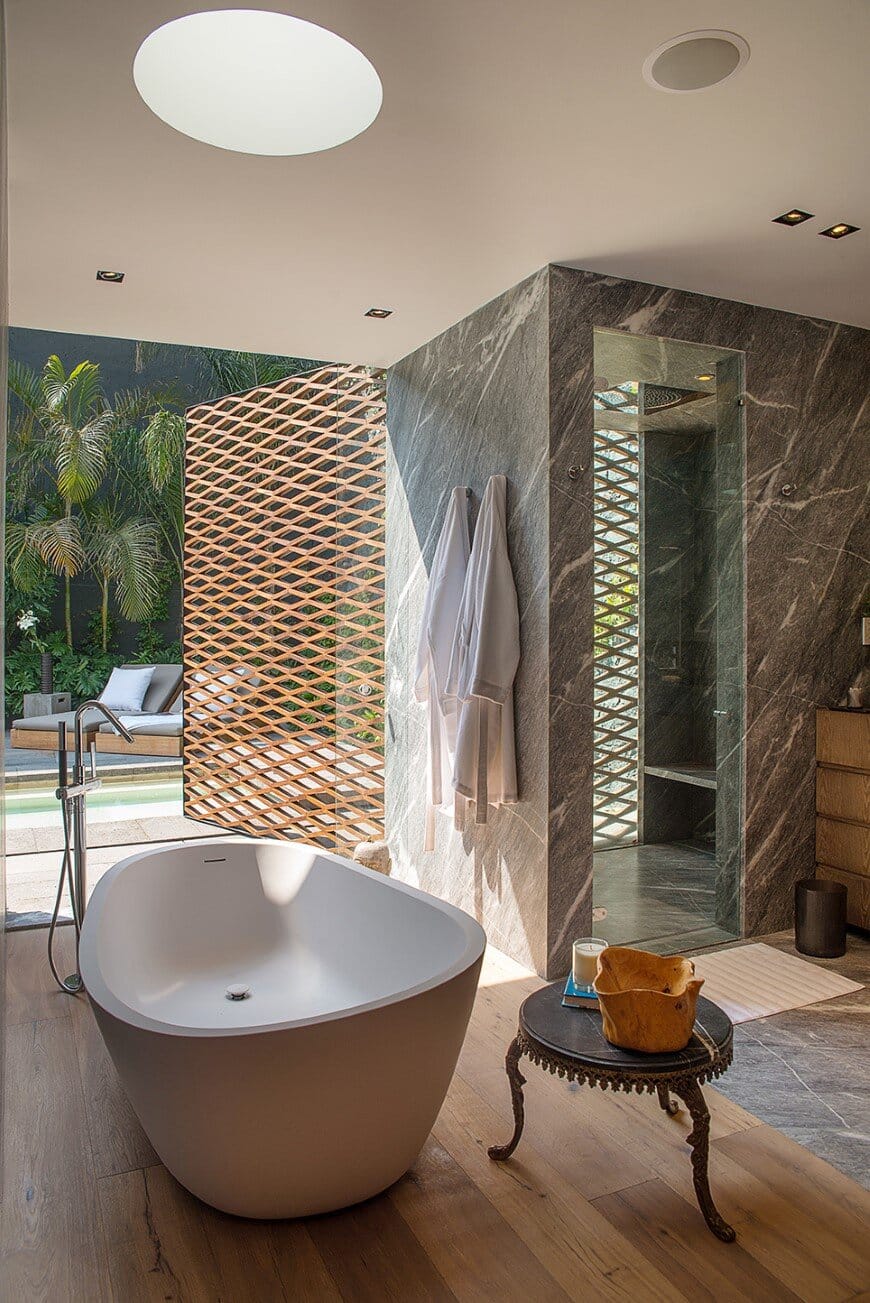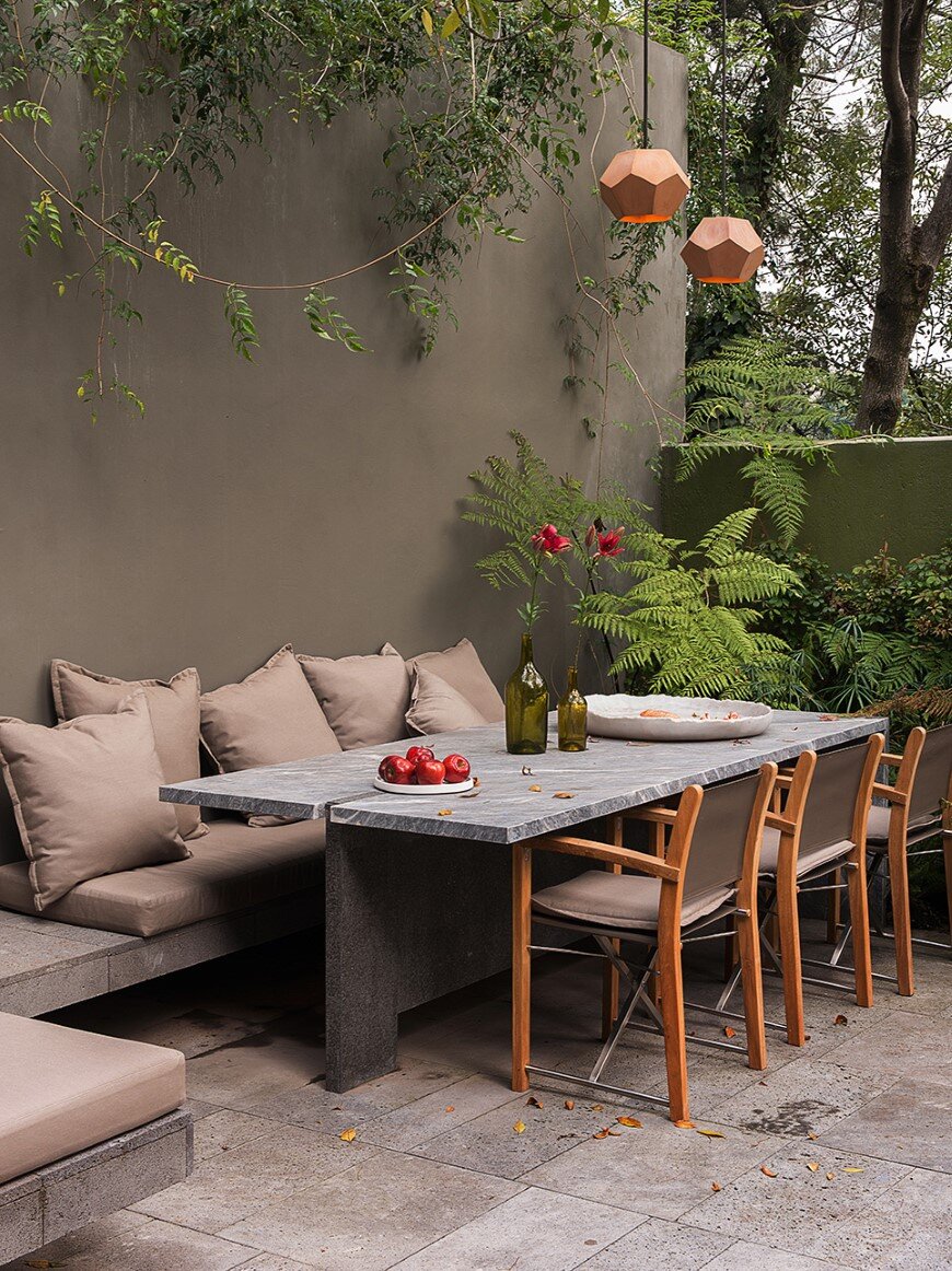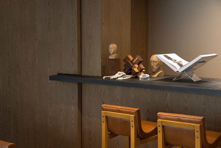 Texture and materials include marble, stone and wood combined with neutral, earthy colors such as dark green and chocolate which tie the interiors with the home inside. Photography: Jaime Navarro, Roland Halbe
