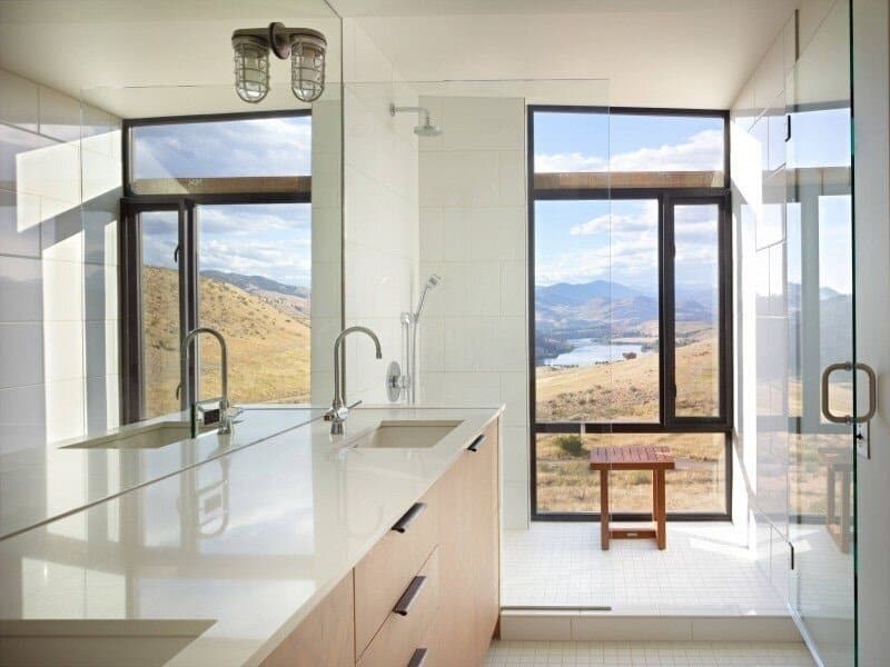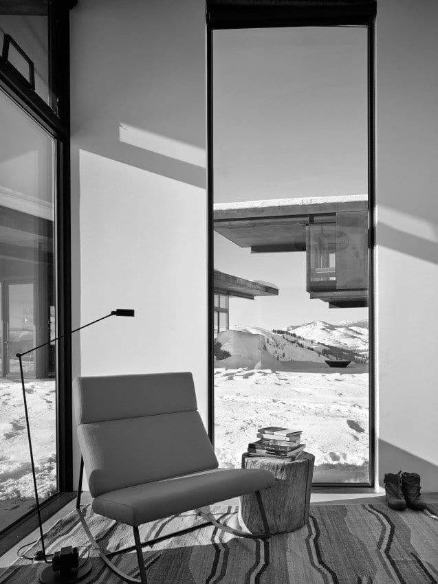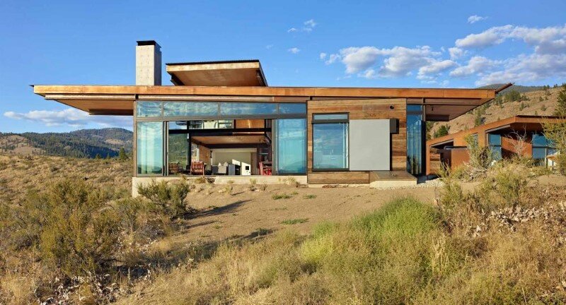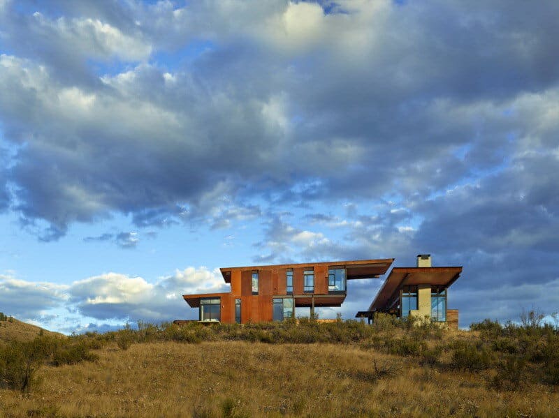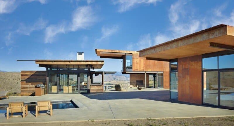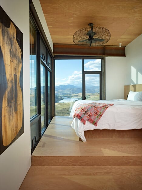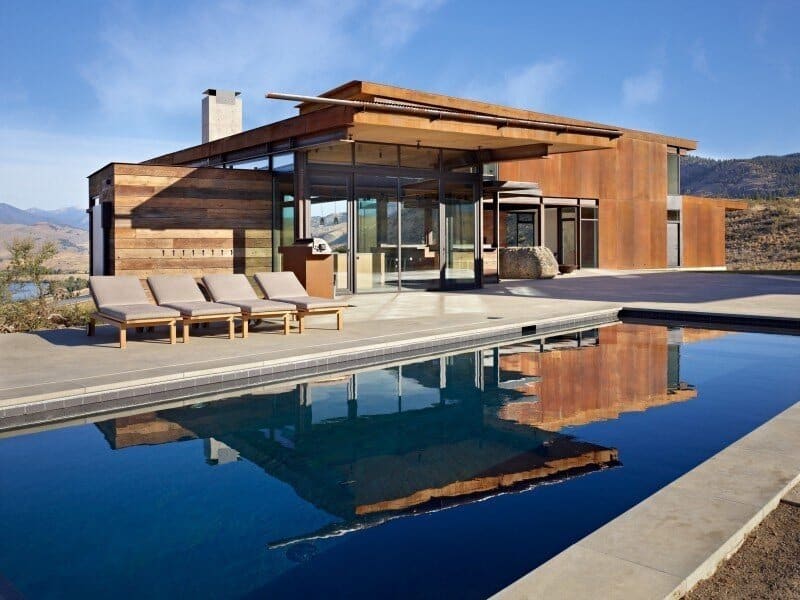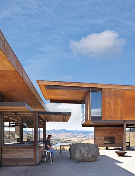 Description by Olson Kündig: Set in the remote Methow Valley, Studhorse responds to the clients’ desire to experience and engage the surrounding environment throughout all four seasons. Referencing the tradition of circling wagons, the buildings—four small, unattached structures—are scattered around a central courtyard and pool. The 20-acre site is nestled in the northern portion of the 60 mile long glacial valley and the buildings are arranged to frame carefully composed views of the surrounding Studhorse Ridge and Pearrygin Lake.