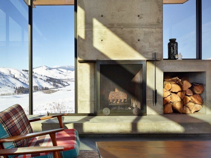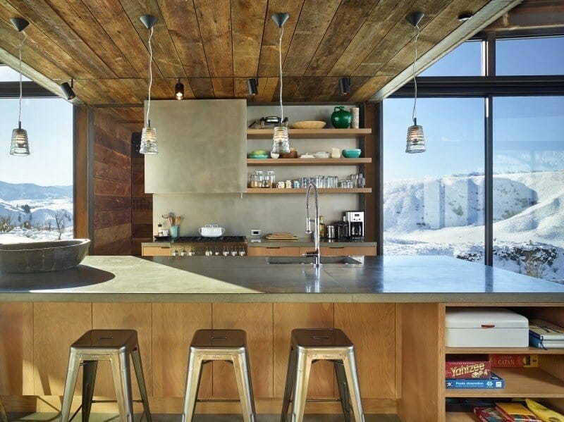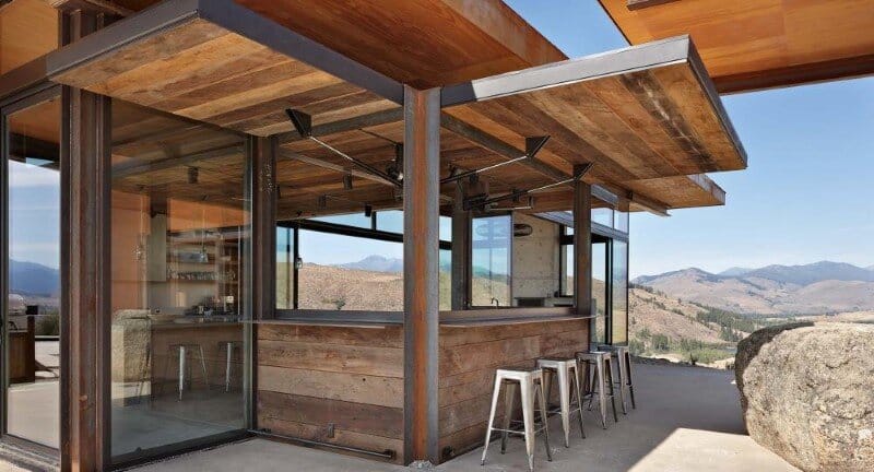 Tough and low maintenance building materials, mostly steel and glass, were utilized to stand up to the equally tough environmental conditions—from hot, fire-prone summers to snowy winters. Wood siding used throughout the project was salvaged from an old barn in the valley. The varying tones of the wood reveal its history and use. Over time as the wood and steel weather, the home will become more and more muted in appearance, blending into the landscape.