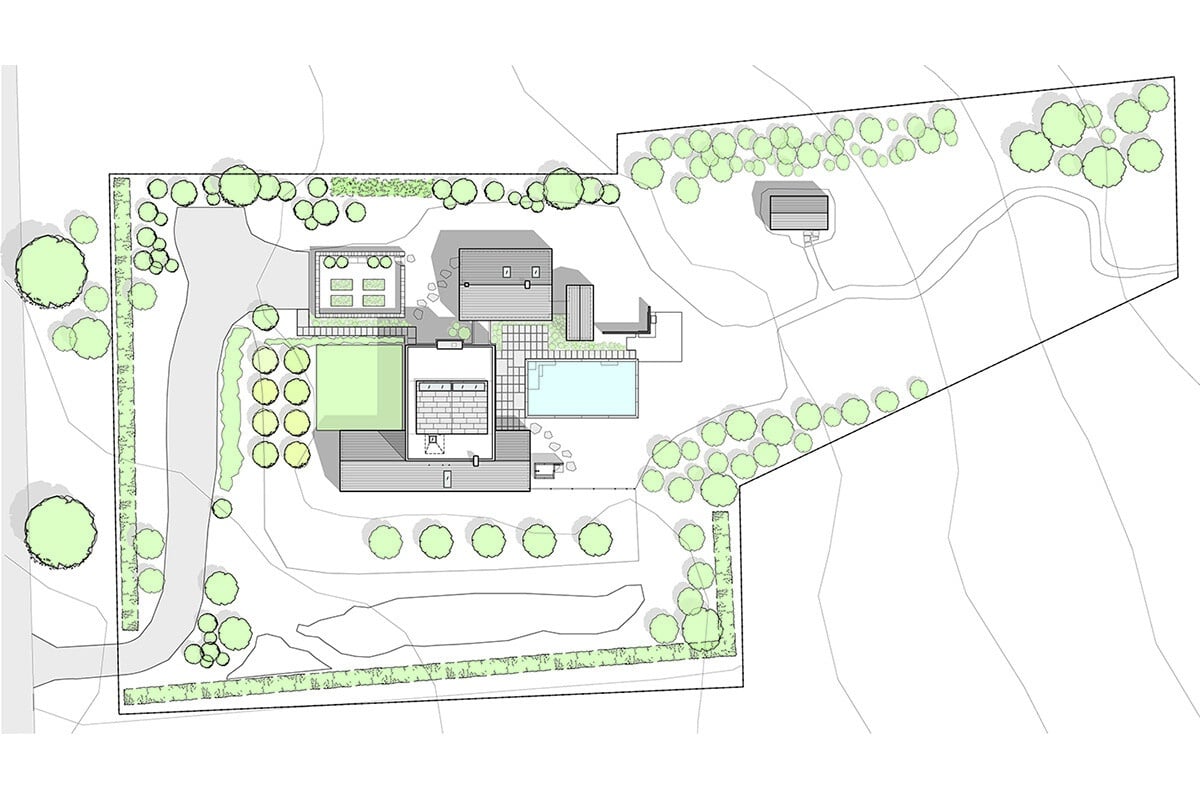 Rather than strip away everything that had been added, the kitchen, dining, and main entry were reorganized into a new, double-height volume located where the small bedroom barn once stood. That barn was moved to a more remote site on the property, where it now serves as a small guest house. The new structure that replaced it becomes the shifted domestic and geometric center of the house, acting as a mediator between the two original barns and the subsequent bedroom wing.