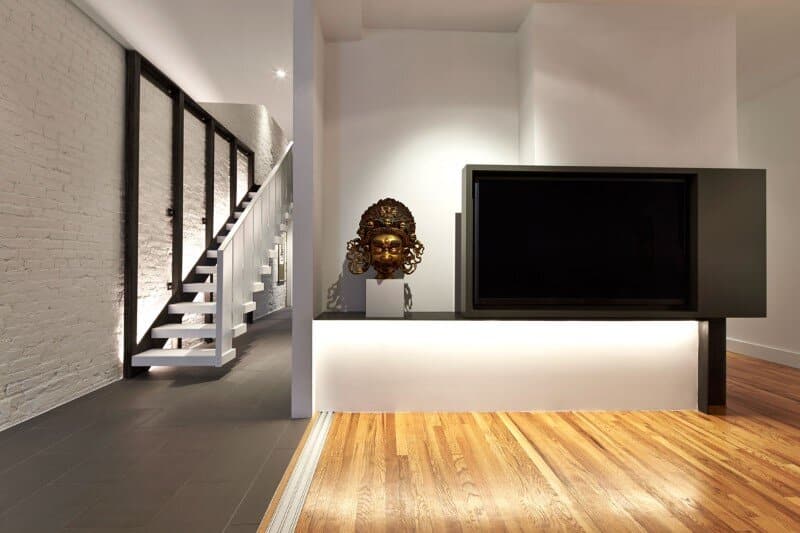 Description by Kube: The Owners of this home love to cook, and their first requirement was a “cook’s kitchen” as the centerpiece of the house. In addition, they have a strong color preference for black and white. Thus the concept of “salt and pepper” was developed as an inspiration for the design palette. The Owners are also art collectors, so the display of art in the house was another critical component. White walls with black framing elements became a logical extension of the concept.