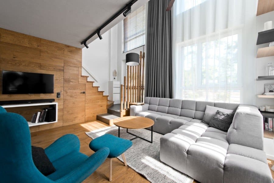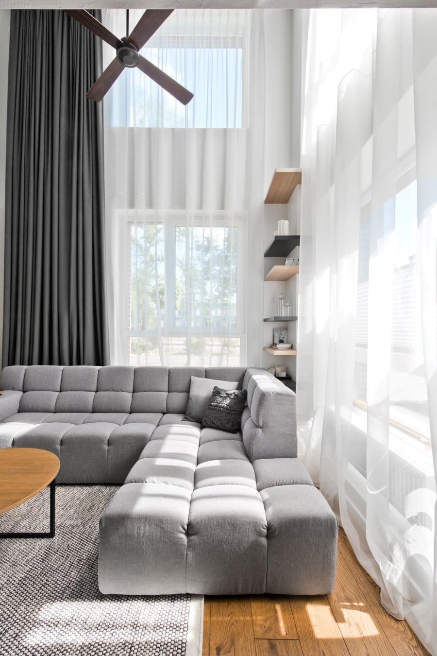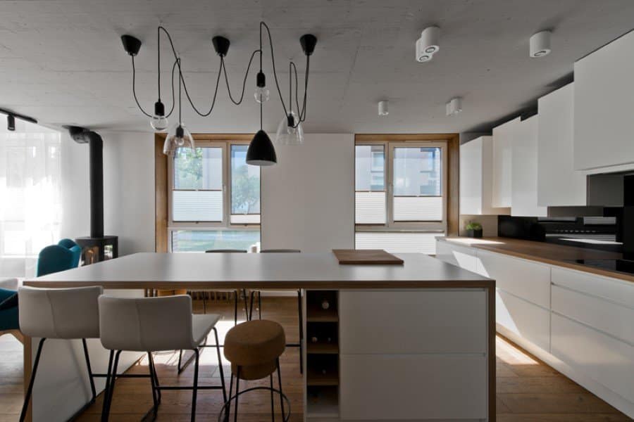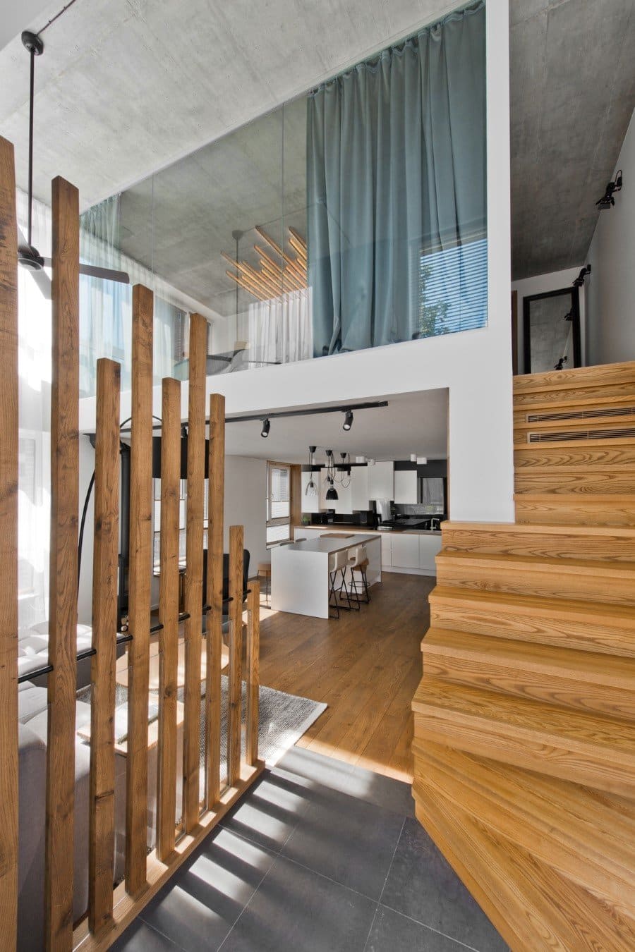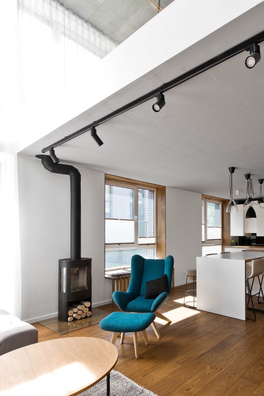 Description by InArch: The task is to create a cozy Scandinavian modern loft interior for a young couple. The first floor has a kitchen, dining and living area. The entrance area due to direct entrance is covered with a wall of dots with glass between them. A large fan in the ceiling. Under the stairs, the space for storing things is maximized. Kitchen area, boiler and sophisticated wall relief designed for unconventional shapes with different cabinet sizes. The bedroom on the second floor is separated by a large glass, a small bath and a work room. Photos by Leonas Garbačauskas