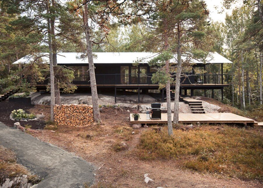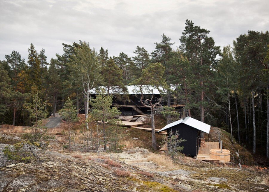 Description by Strömma Projekt: Located in the Stockholm Archipelago is this hilly plot with its pine trees and bilberries. It has a dramatic topography with the main building resting on a ridge next to a ravine.
