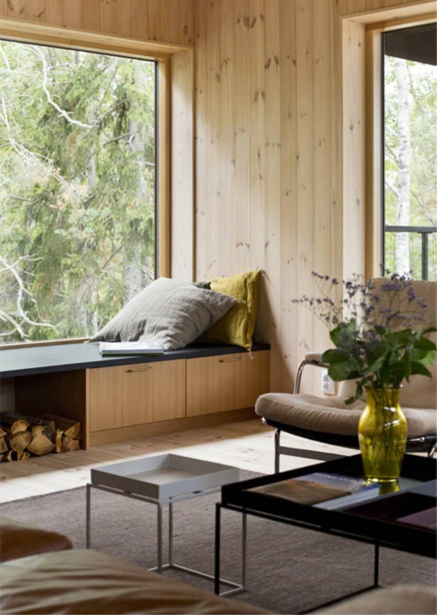 The house rests on a foundation of black concrete plinths and is characterized by its wood feeling that is enhanced by the nearby trees. Its dark timber exterior interacts naturally with the surroundings and the high ceiling and large windows facing in all direction makes the house very spacious.