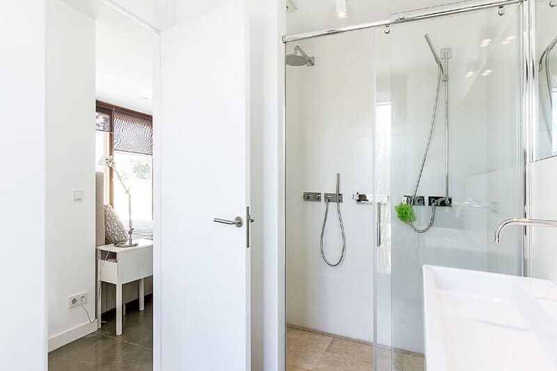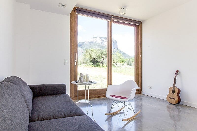 The finca with approximately 230 sqm of living space – divided into a living, bedroom and utility wing – can accommodate up to eight people. All rooms have floor to ceiling windows offering views into the large garden with mature trees and to the foothills of the Serra de Tramuntana. The house has a 4 x 10 meter pool and a spacious terrace. Baix de S’era.