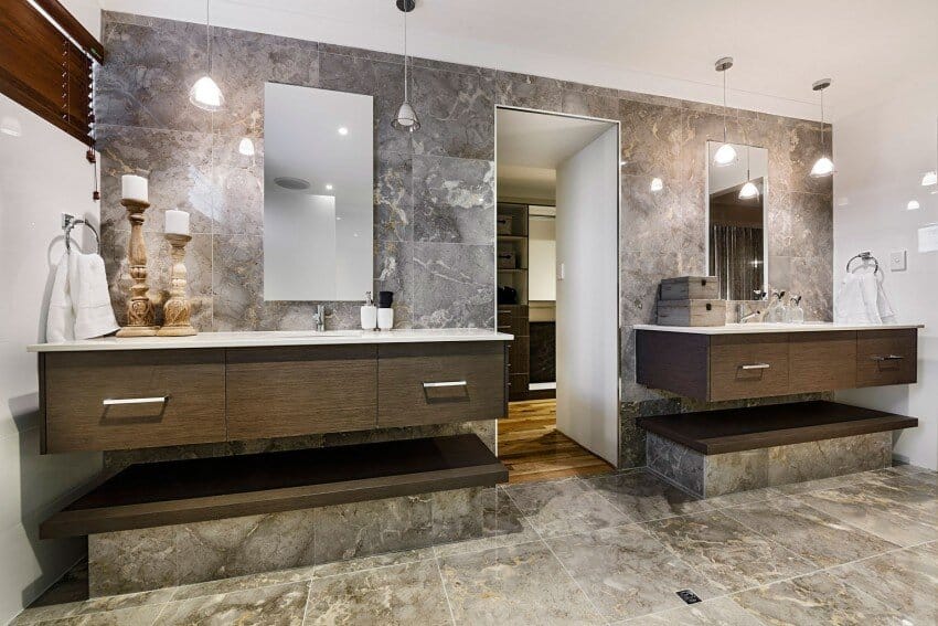 The modern exterior showcases the harmonious relationship that can be achieved using a mixture of materials and finishes, including carved in-stone features, dark-stained timbers, texture-coated rendered external walls, Scyon Axon cladding and a Colorbond roof.