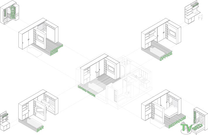Description by MKCA: The 5:1 Apartment is the latest evolution of MKCA’s research on micro housing, containing the functional and spatial elements for living, working, sleeping, dressing, and entertaining, plus kitchen, dining, and bathing space within a compact 390 sf.