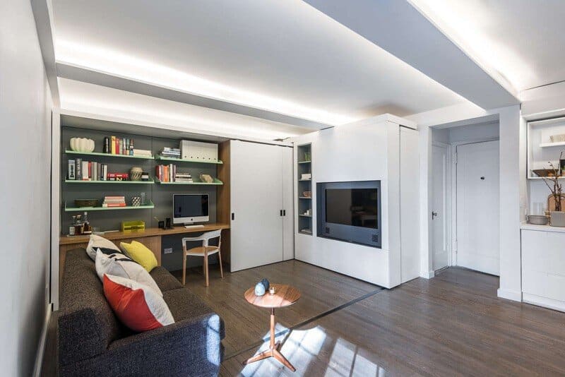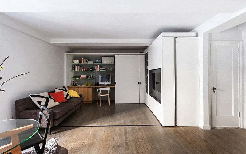 Michael K Chen Architecture (MKCA) have designed a 390-square-foot studio in Manhattan, that features a mechanized moving wall to form different areas when needed throughout the day.