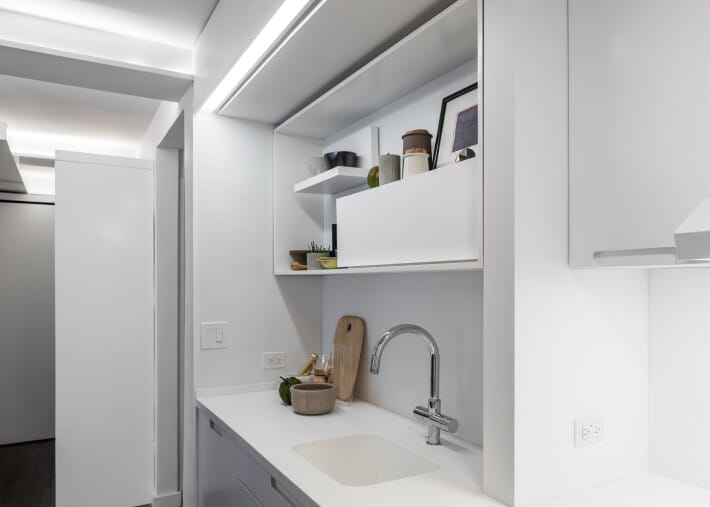 Situated in a 1920’s co-op building in the Gramercy Park neighborhood of Manhattan, the apartment was entirely reimagined by MKCA. The existing kitchen was expanded to create more working space. New minimally detailed solid surface counters with integral sink and white lacquered cabinetry with integral pulls were added, along with generous pantry storage and refrigerator. The existing bath was thoroughly renovated and an additional linen and laundry hamper cabinet was added, along with a new pocket door. New LED lighting was added throughout the apartment, in a lighting cove above the cabinetry, and along millwork lighting baffles added to the underside of the existing beams.
