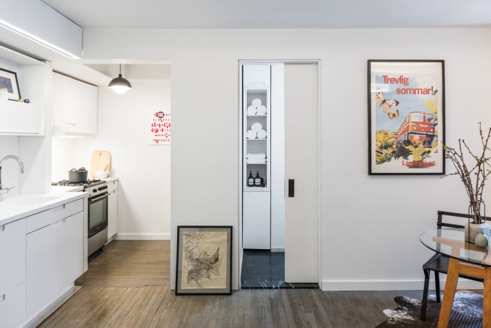 During the day, or when the bed is closed the bedroom space is returned to the living and working spaces of the apartment. Rows of open library and display shelving in powder-coated steel are cantilevered from a lacquered cabinetry wall. Lower cabinets house a printer and other computer peripherals, while an adjacent cabinet is used as a dry bar. A pair of sliding doors reconfigure the unpacked spaces, revealing zones for dressing and storage while masking work zones or vice versa. Space for a full-sized sofa is preserved opposite the television and sliding wall. A dedicated dining area large enough for four was created adjacent to the living room.