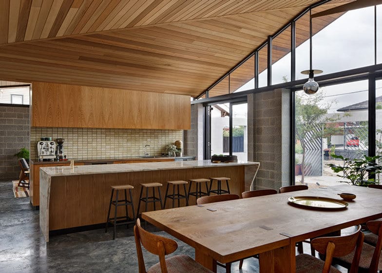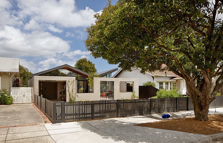 Description by MRTN Architects: On the fringe of Melbourne’s inner suburbs, this new family home sits in an established residential street of Victorian villas and Californian bungalows. From the footpath, the Fairfield Hacienda with its angled roof fits into the landscape of single-level homes, effortlessly picking up the street’s original pattern of hipped and gabled roof forms. A closer look however, reveals that this new house sits unusually behind a sunny, walled courtyard. This room without a roof, except for a sheltering courtyard tree, is an extension of the living and dining spaces that open onto it.