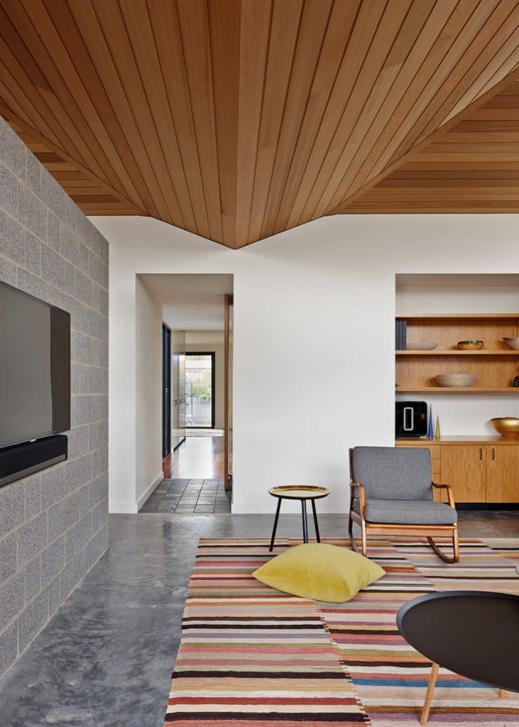 As with our commitment to ensure the Fairfield Hacienda preserves the flow of the streetscape, we’ve applied a similar fluidity to the concrete walls of the courtyard, which continue without interruption throughout the house’s main living areas. These walls remain unchanged except for the patina. Outside they are rough and weathered, but become polished and honed once inside. The space is covered with an undulating canopy of cedar, a warm blanket of timber.
