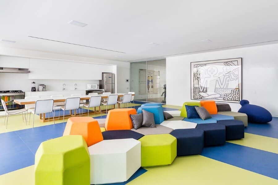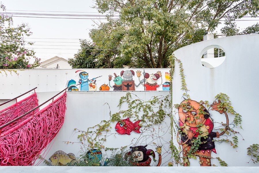 To add to the playfulness of the project, the tower gate was turned into an observation tower like a fort apache. It is connected to the house through a fun red rope bridge that passes over a garden, resembling a small jungle that is located on the ground entrance floor. Special Brazilian graffitis decorates the wall of the space, with other artworks from Anish Kappor, Keith Hering and OsGemeos that are playfully integrated to the architectural project.
