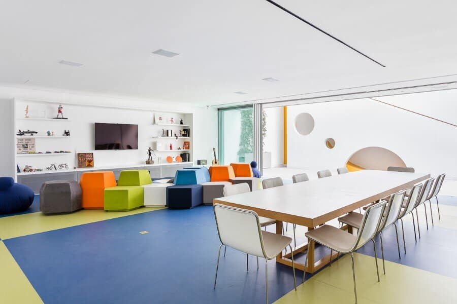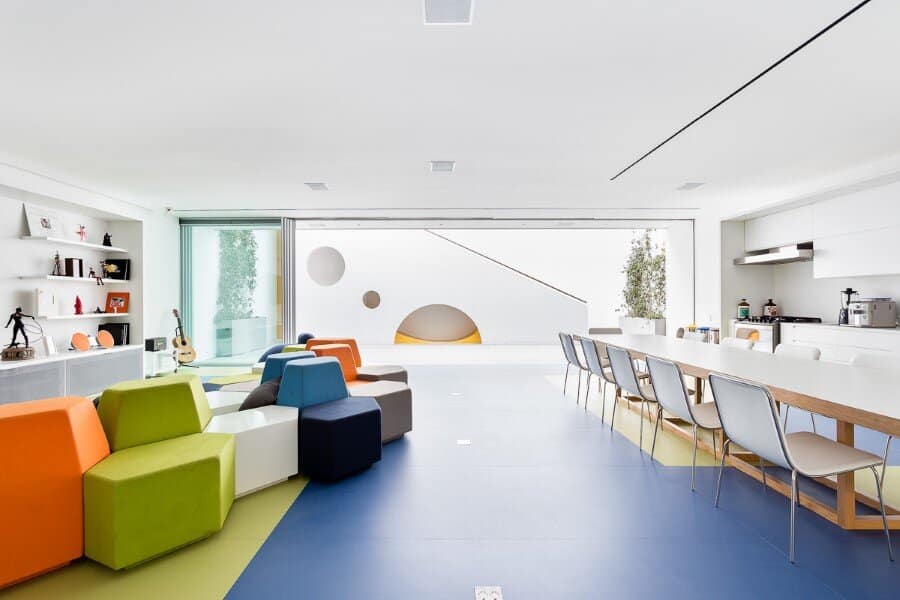 The lower floor is a large TV room for video game and cinema sessions, with an integrated kitchen available for cooking support. It is marked by a minimalist architecture without excesses and easy to maintain. Sliding doors on both sides connects the space to the external part, that has a big slide integrated under the stainless steel staircase located on the back end of the house.