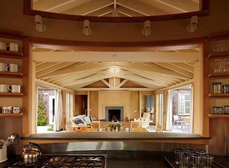 The plan evolved into an H shape, with a living room at the center, and the wings creating outdoor spaces facing both the Pacific Ocean, and the coastal range, in either direction. Rather than having an outdoor living room, the traditional living room has large sets of sliding doors that open to a position that matches the adjoining windows exactly, creating a distinctly outdoor experience. Depending on the weather, the doors can be open to the ocean, mountains, or both which provides great flexibility for enjoying the outdoors, indoors.