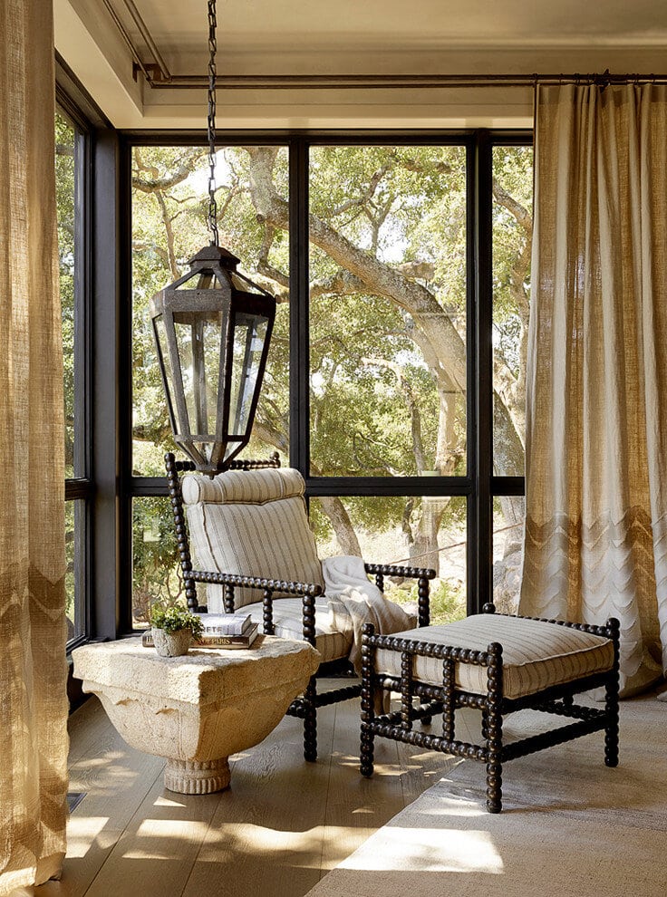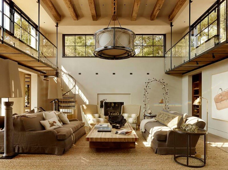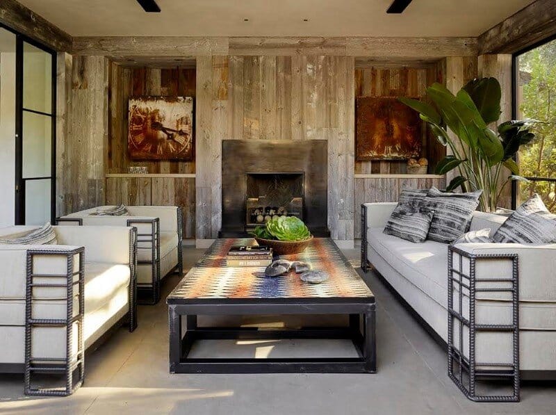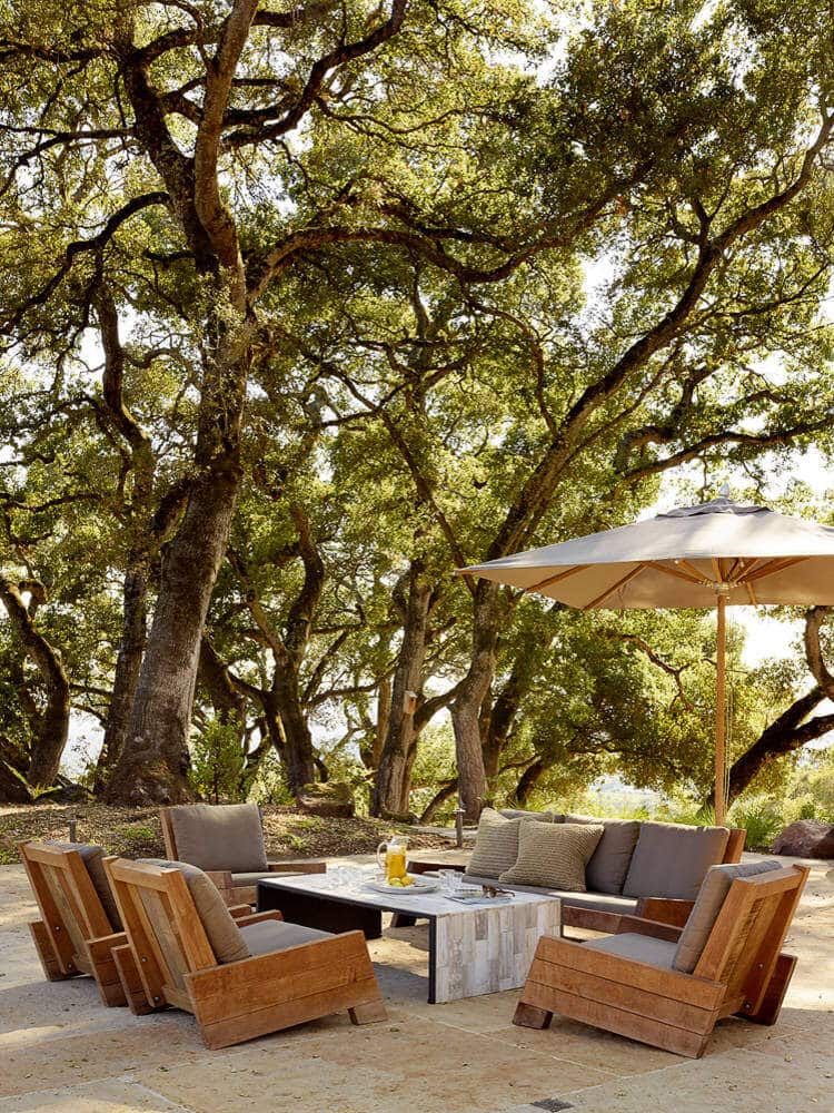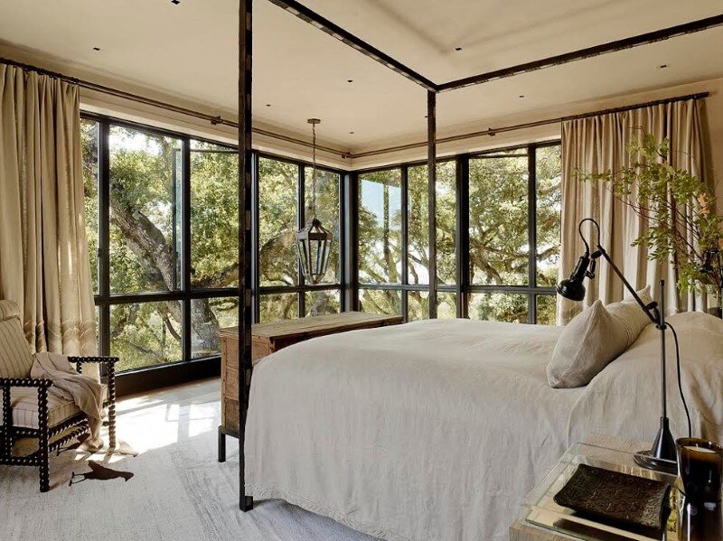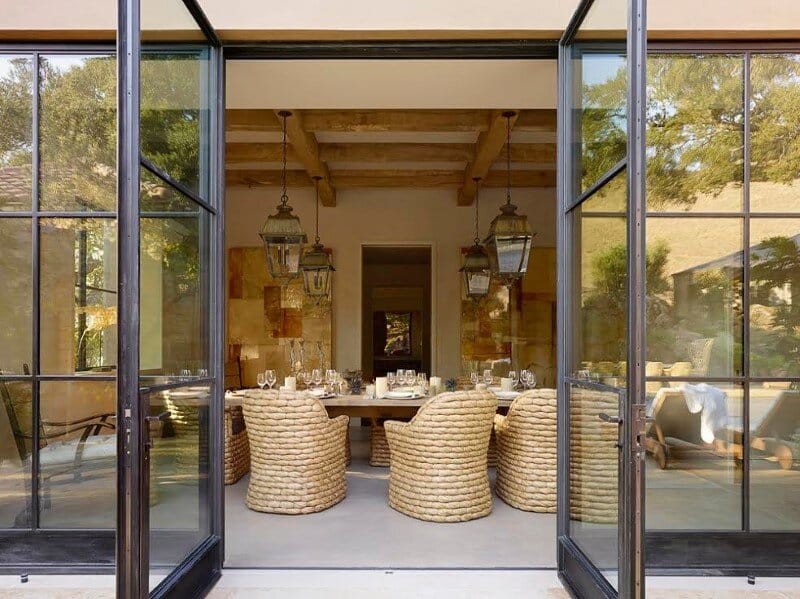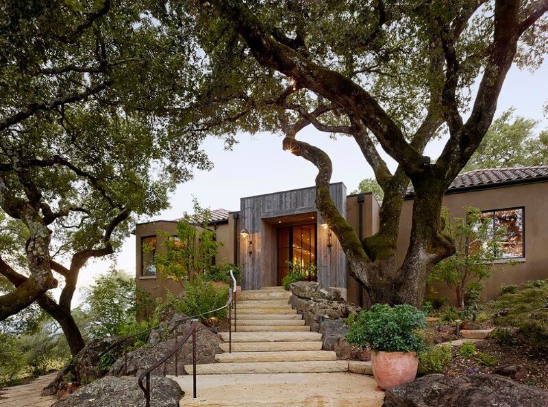 Description by Ken Linsteadt Architects: Turning an eye to the outdoors, this metamorphosis of a traditional Tuscan villa into a modern country home frames the oak-studded beauty of the Sonoma wine country landscape from every window. The owner’s reclaimed timber business set the earthy natural palette: recycled oak, steel windows, hand-troweled plaster walls, and concrete floors and counters.
