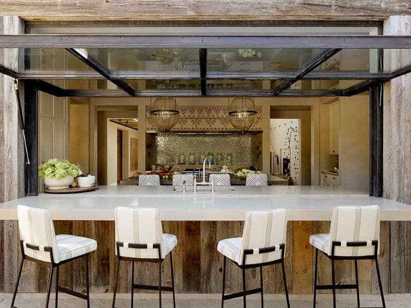 The reconfigured floor plan of the main house includes a rough-hewn timber catwalk around the double height living room, juxtaposed with steel supports and glass railings. The kitchen, which was moved to the north side of the house, opens onto the pool terrace with a large steel and glass tilt-up window that does double duty as a canopy over the outdoor bar. Visit Ken Linsteadt Architects