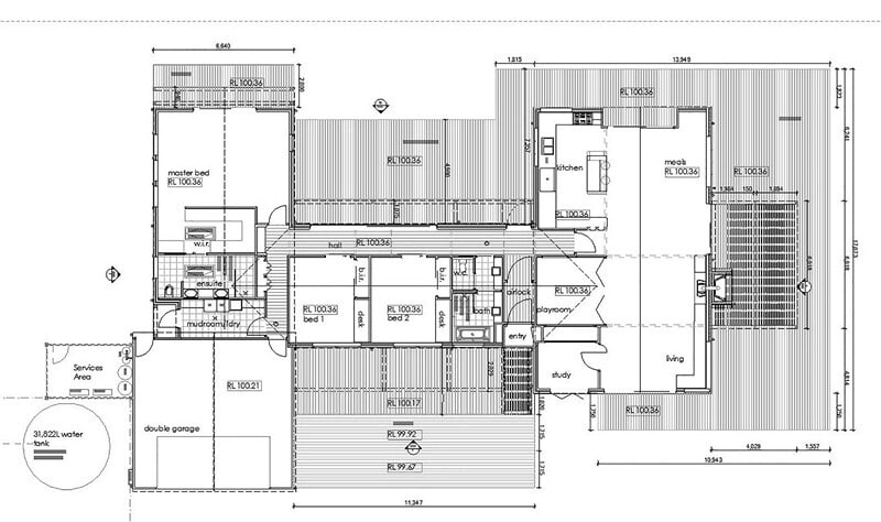 The Trentham house is located in one of the highest rainfall regions in the state of Victoria. The roof was pitched to allow this rainfall to be collected efficiently through a wet system to various tanks making the house self supportive and included the allowance for firefighting. The house is double stud walled (except the garage) to allow a huge amount of additional insulation to be provided. This and the roof-space area allowed the house to be very well insulated, with reduced risk of this leading to condensation issues through use of breathable sarking and additional external air barriers and insulation to roofing to have less thermal differentiation between outside and in which leads to condensation.