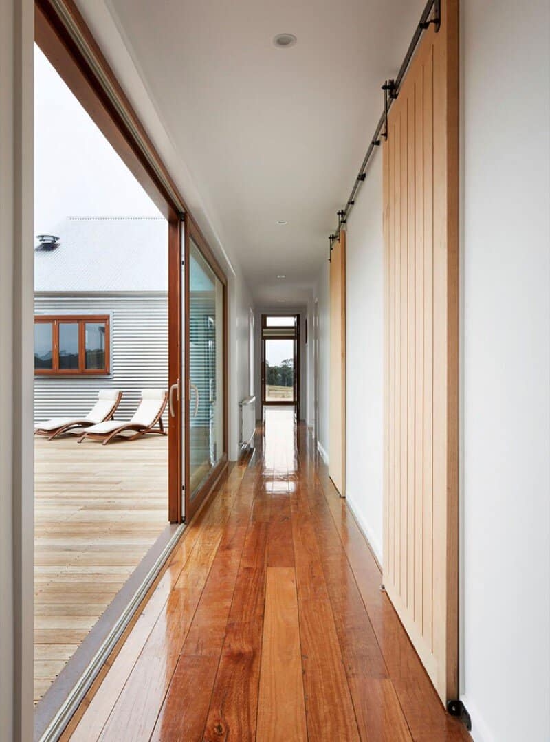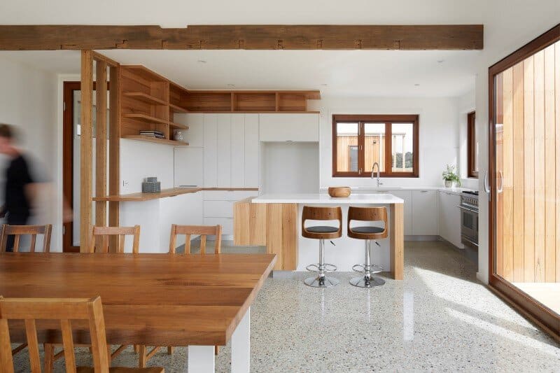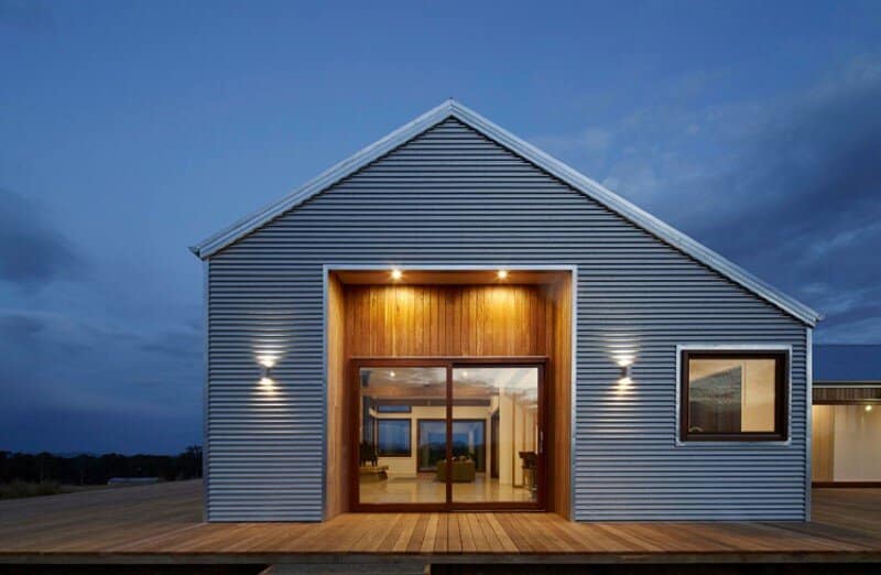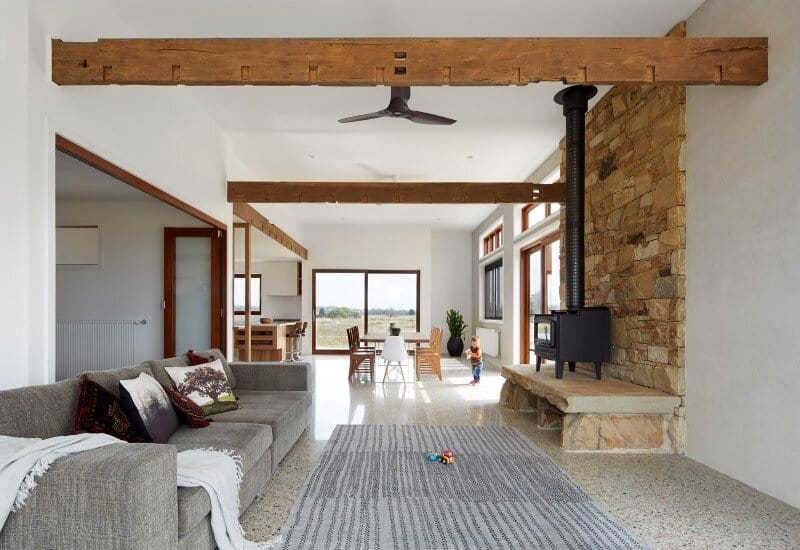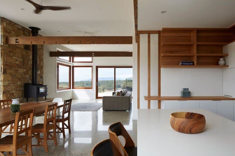 To the Northern wall the use of reverse brick veneer allows the walls inner thermal mass to take in the heat of the day, and give it back of a cooler evening balancing the temperature. Additional thermal mass is produced through the polished concrete insulated slab. Awnings control the light which hits the slab by using awnings pitched to allow winter sun, and exclude direct summer sun. The windows are double and triple glazed. When heating is required this comes from heat exchange units to radiator panels throughout the house. Fire resistance comes from using re honed fire resistant Black-butt timber. The beams are recycled timber from a school house. Corrugated galvanised steel was chosen not only to give low maintenance, but also assists in reflecting heat. Heat is not conducted into the building from it due to air gap behind the steel. The land has 270 Eucalypt Acacias planted thus far. Local stonemason employed working with local Castlemaine rock for chimney. Timber frame prefabricated in factory allowing offcuts to be re used in factory setting and more controlled build. Water saving toilets, shower heads and appliances.