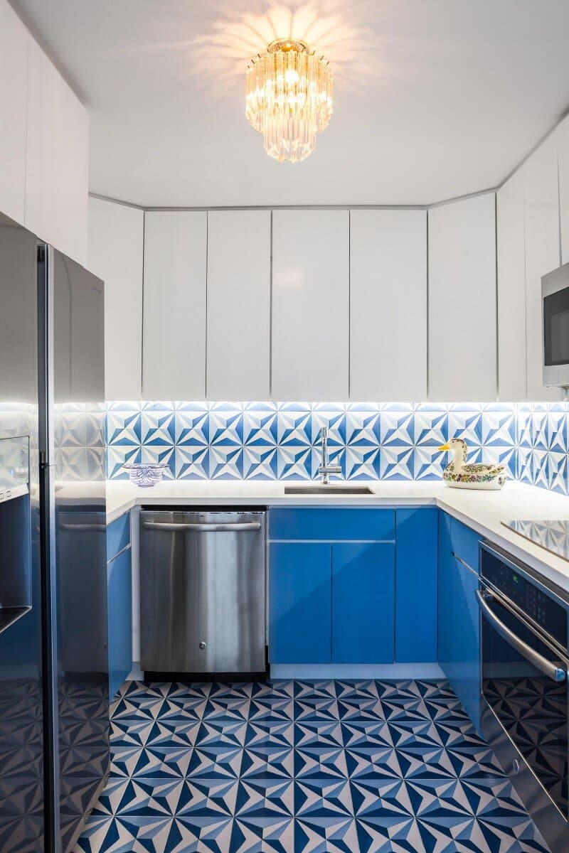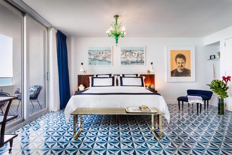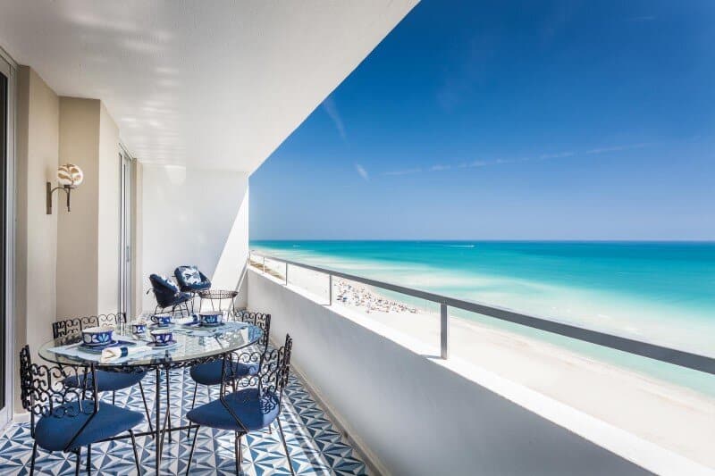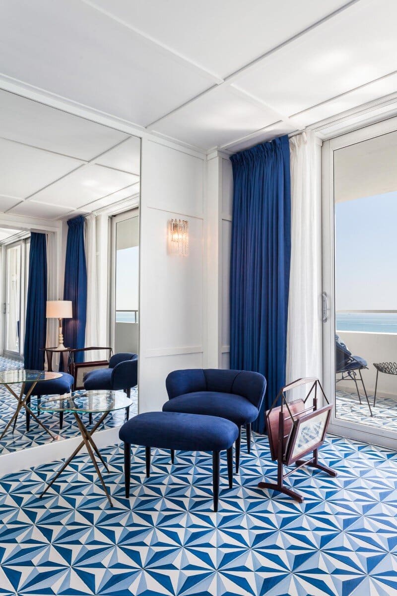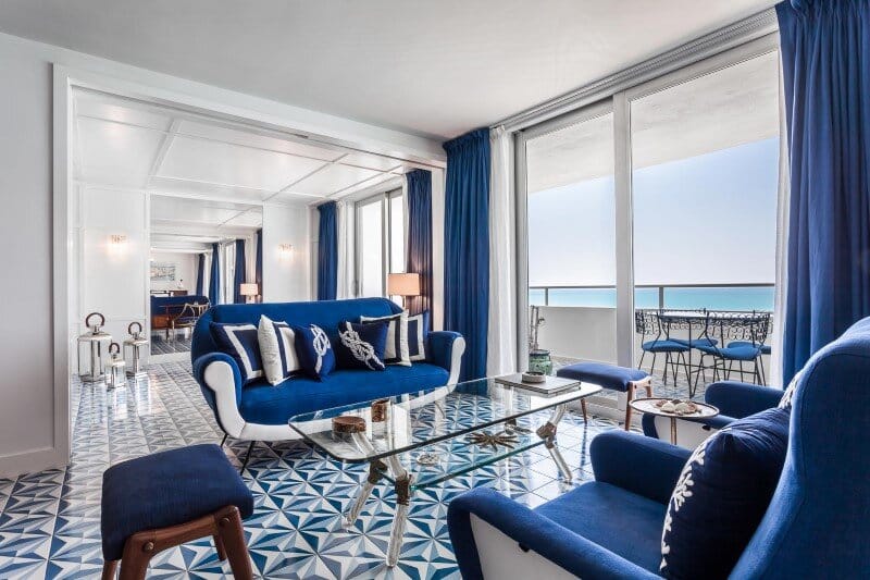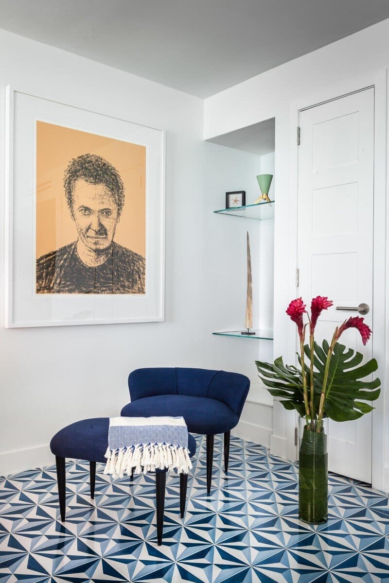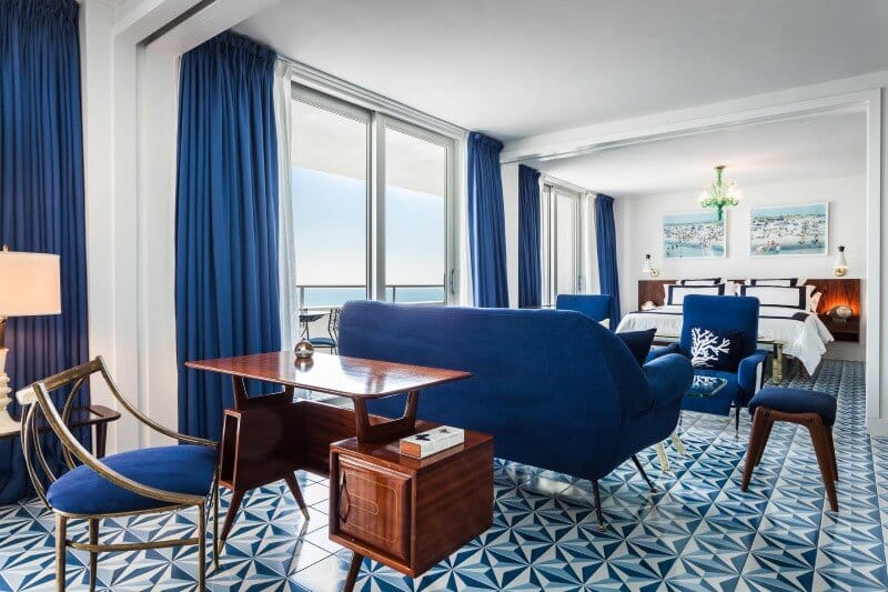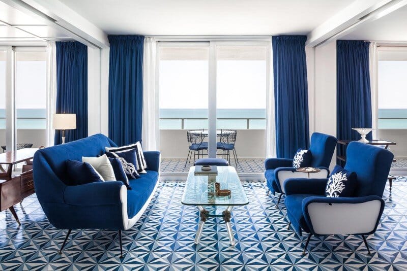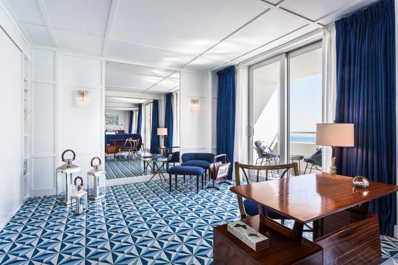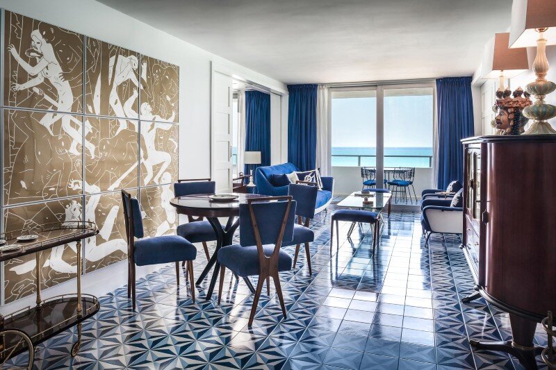 The result is a flexible and flowing space where all rooms enjoy wide angle oceanfront views. Even the master bathroom and closet were reconfigured to connect to the bedroom via a door-less entry and glass display shelving. Linking all spaces to the balcony are hand painted blue ceramic tiles designed by architect-designer Giò Ponti. This color scheme extends the 1040 square foot enclosed space to the Miami blue ocean. Visit Luca Andrisani Architect