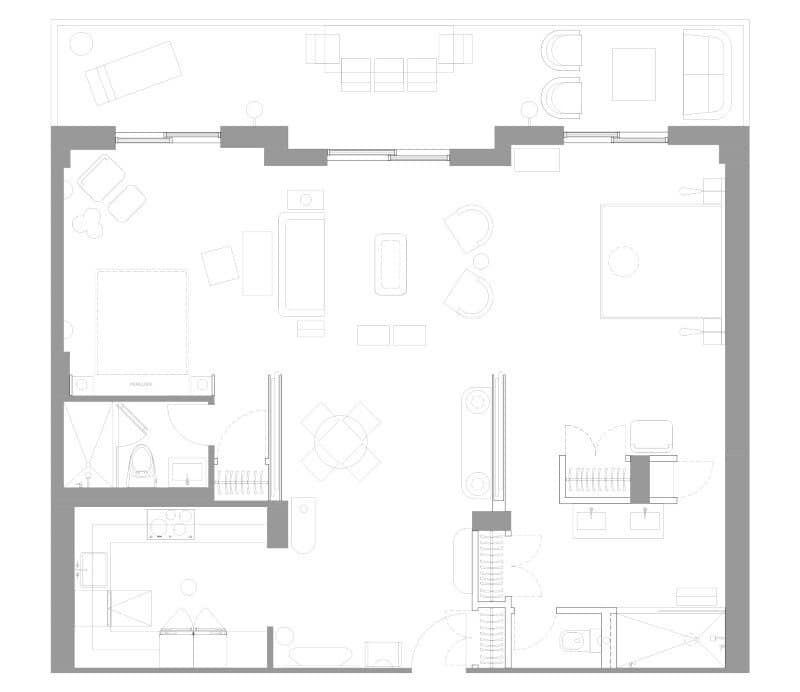Description by Luca Andrisani: This two bedroom apartment renovation took place in a building called Oceanside Plaza, built in 1967 in the Millionaire’s Row neighborhood of Miami, Florida. The building’s architect was Morris Lapidus, famous for the Fontainebleau Hotel and identified by theatrical designs and curving exteriors. Despite this reputation, the apartment’s interior was rigid with two closed bedrooms on each side of a central small living room. This renovation’s primary act was to open up the space using two 12’ wide pocket doors in place of walls. This allows the vacation residence to be used as a studio, one bedroom, or two bedroom.