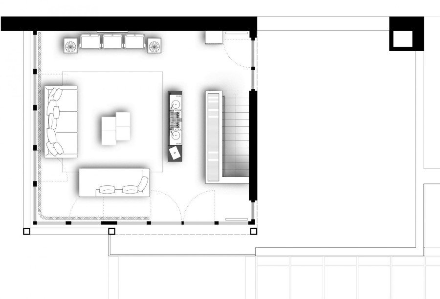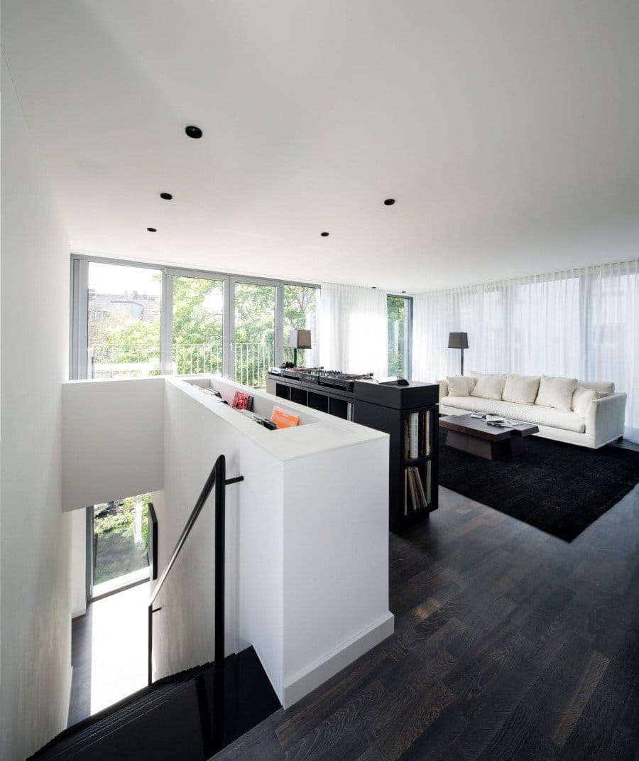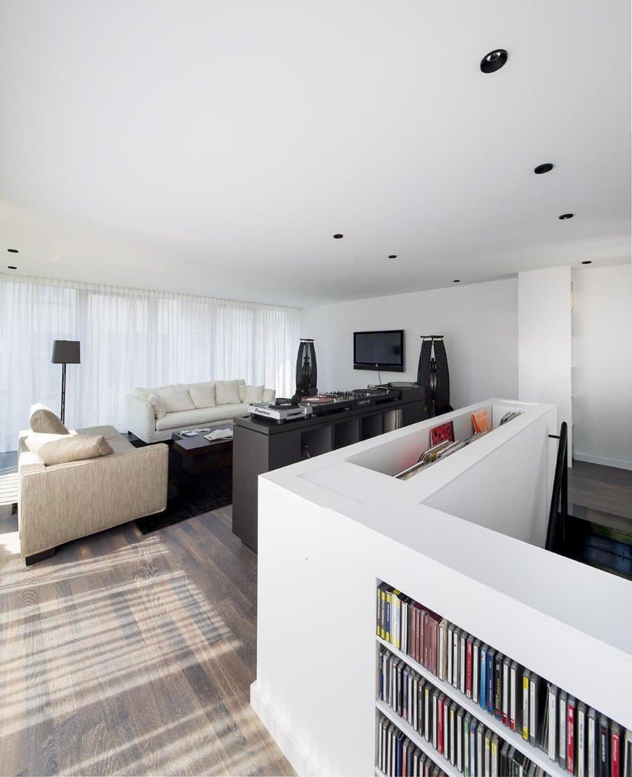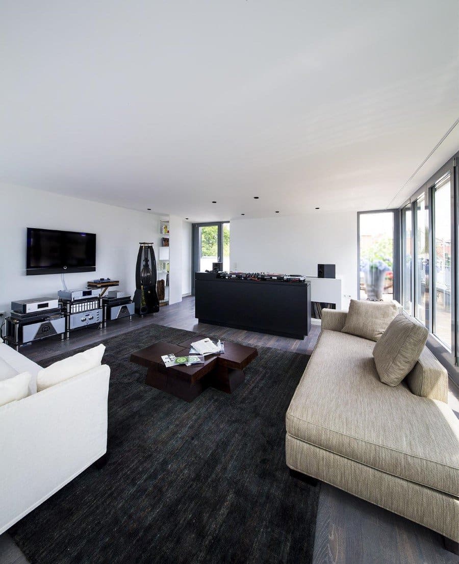 At the upper level, the client wanted to pursue his passion for listening to music, a DJ-console was designed for the music room. The console matches to the black material used for kitchen elements and thus, transports it to the upper level. A disc shelf has been integrated into the half-height drywall parapet in which, like in a music shop, the collection can be searched. An approx. 30 m² terrace complements the upper level.