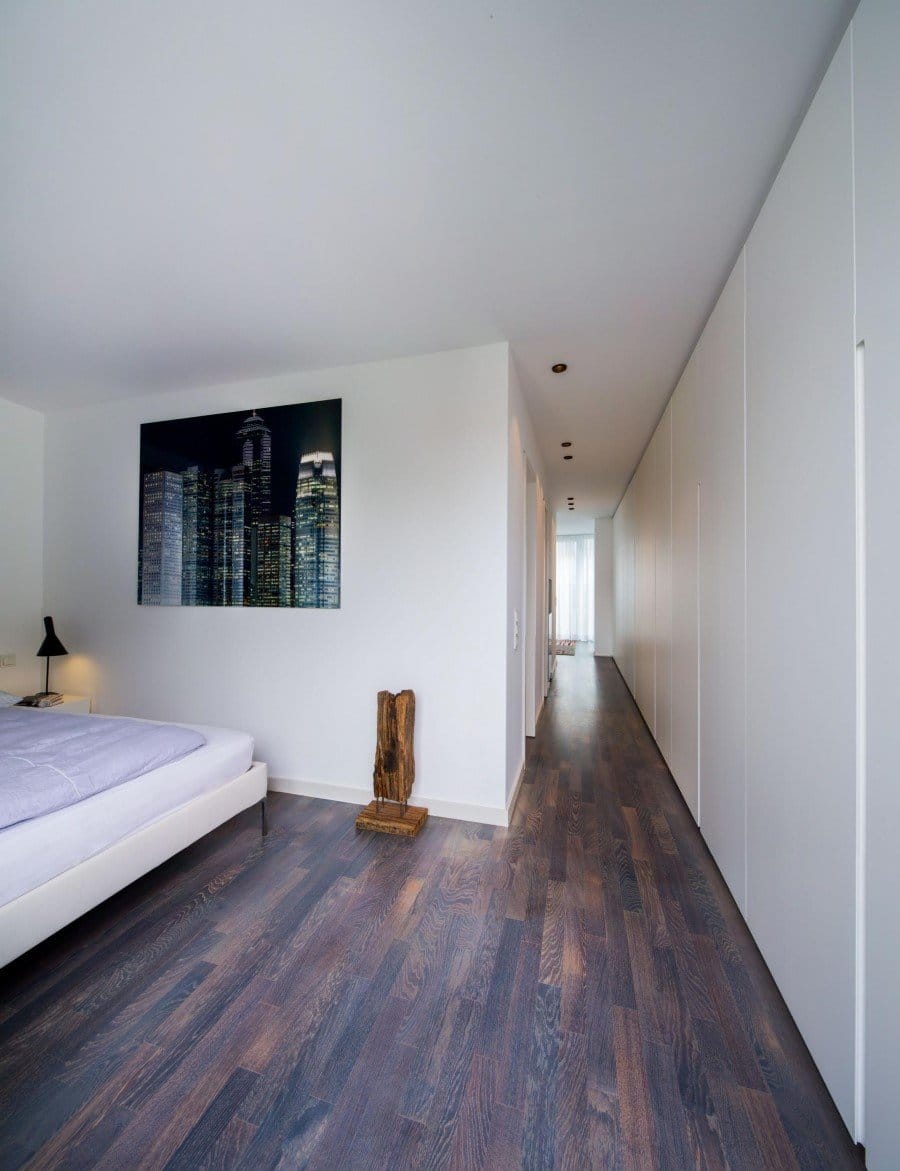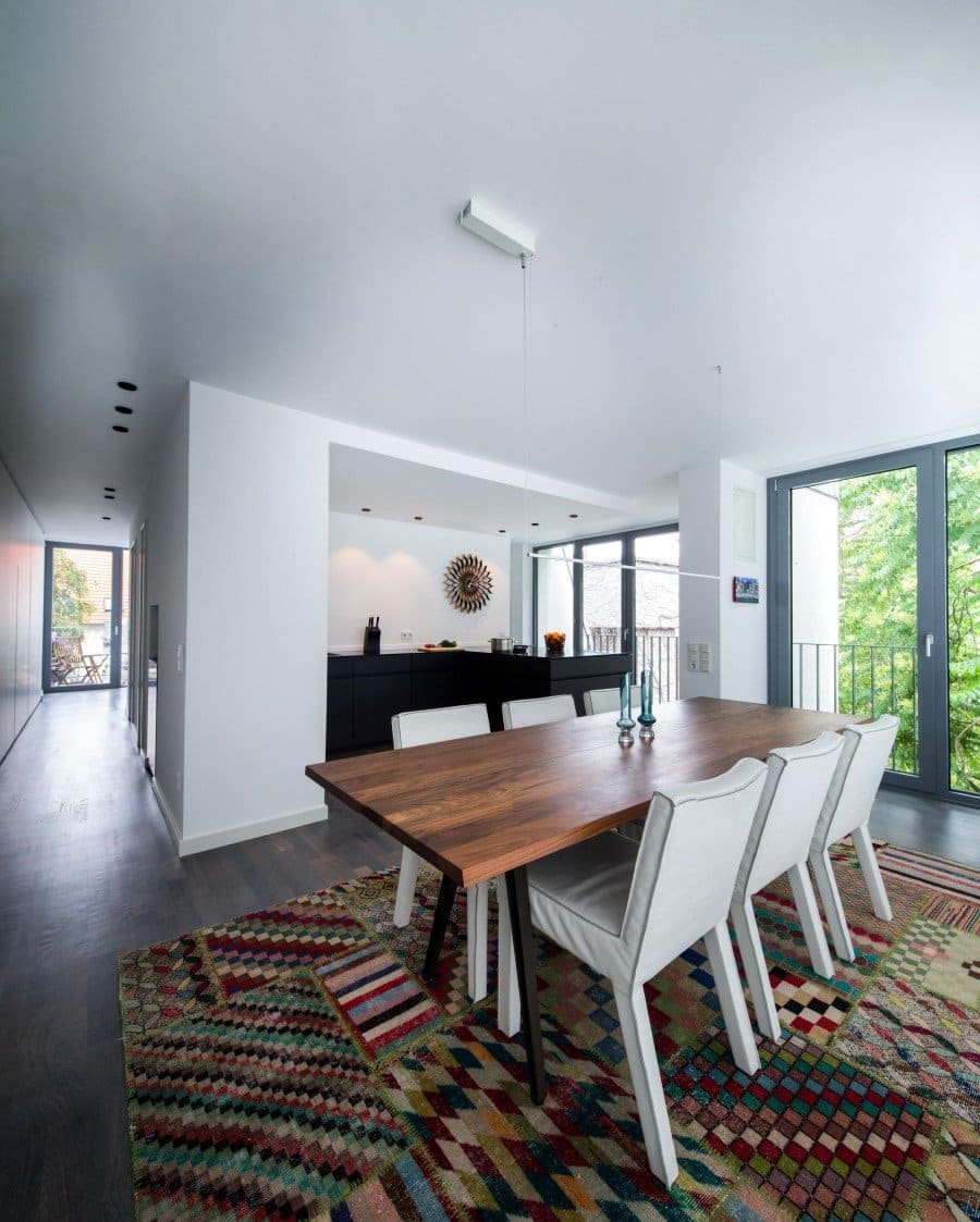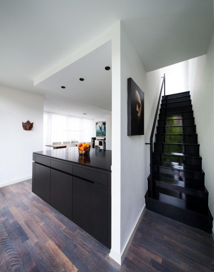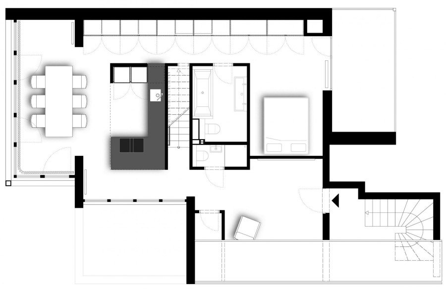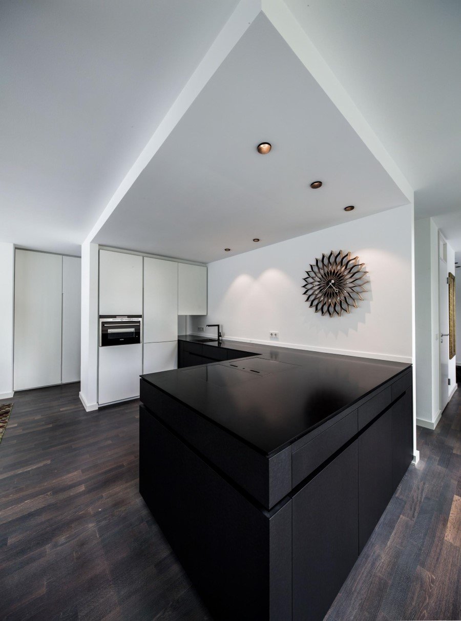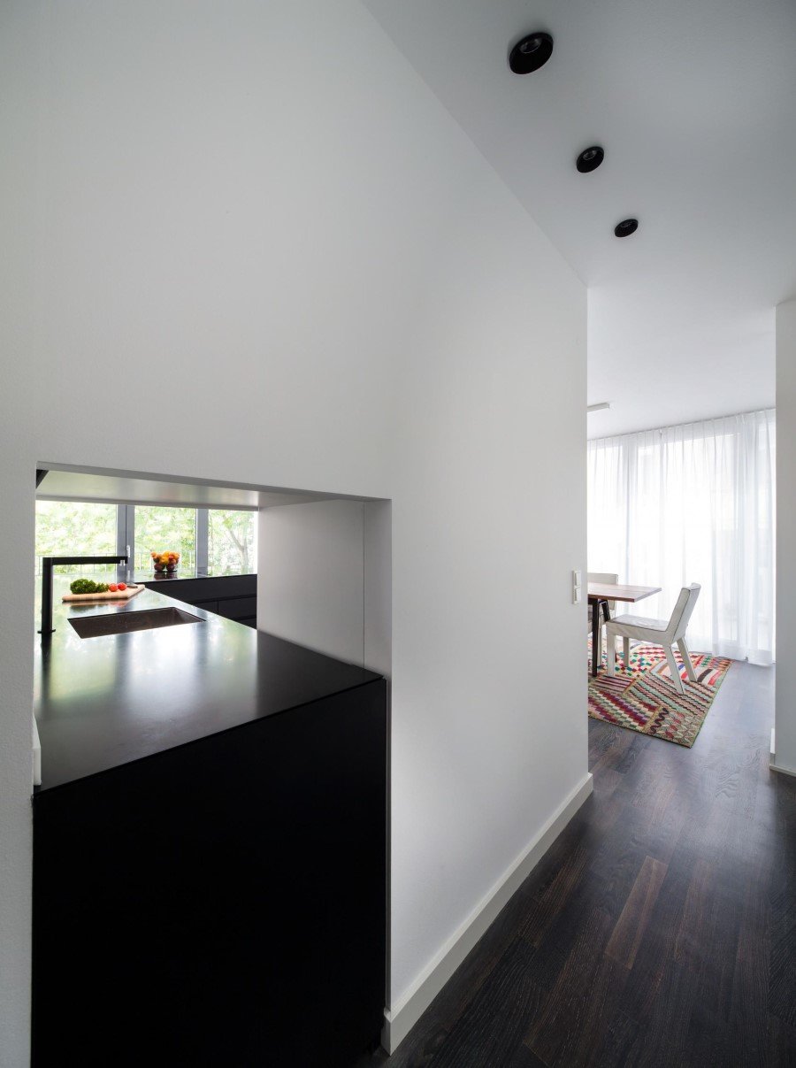 The functional area resumes the two bath rooms and the inner stair case linking the two levels. The kitchen that in contrast to the white walls and ceiling has been made out of black MFD closes in the direction of the dining area. The longitudinal hallway between dining and sleeping area hosts an approx. 8 m in-build board. The kitchen area continues into the hallway. Thus, the lengthy wall opposite of the wall board got accentuated and, a connection established between kitchen and hallway.