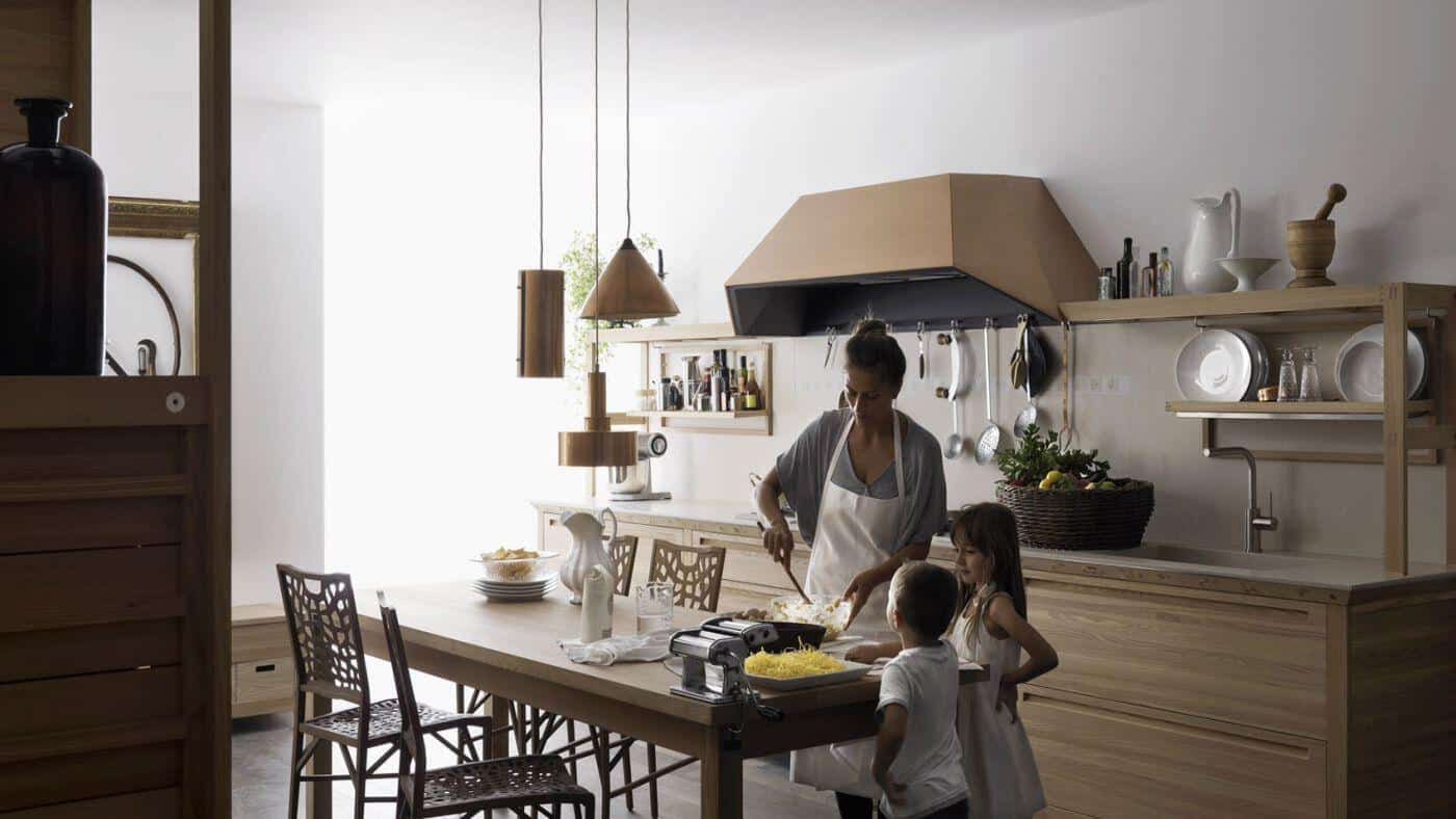 The presence of some old traditional objects and decors increases the aesthetic sustainability of a kitchen because the handmade objects and supplies, handicraft, have a personality and beauty that make them to be valued, more in time. The shelves and pieces of furniture found in the SineTempore kitchens are made of ulm wood with comb or tenon joints. A traditional copper cooker hood with a trapezoidal body, may be present in these kitchens, among other copper decors.
