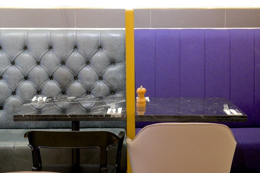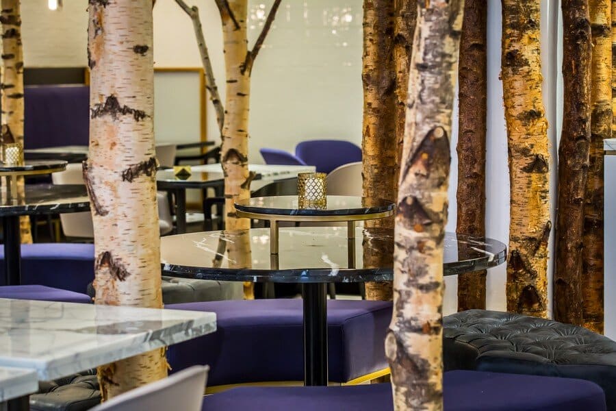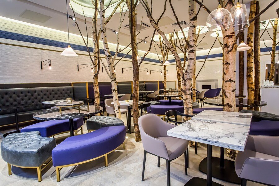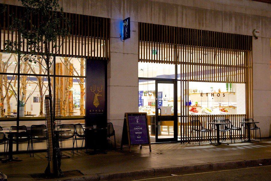 The seating area is made of a mix of timber and marble while for the upholstery of the banquette seating, tones of blue with black and neutral furniture were chosen. Birch trees that are over 4 meters high dominate the main area and in the same time they deliver a natural and organic element. For the exterior, wood panels that blend with glass were used, being covered with a combination between gold, grey and blue. Even though, Ethos is a vegetarian restaurant, due to its design that elevates the dishes and its healthy and tasty food, it successfully attracts meat and non-meat eaters.