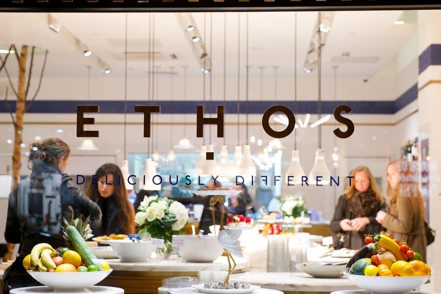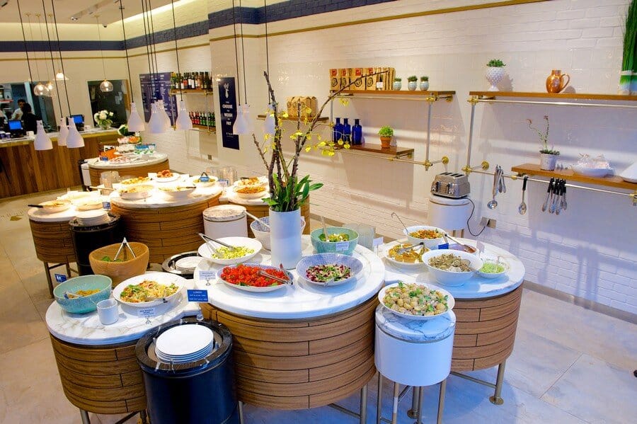 By combining their creative minds, I-AM together with entrepreneur Jessica Kruger have brought the Ethos concept to life. This unique restaurant is located near Oxford Circus in Central London. Being defined by a contemporary and fast-casual concept, Ethos offers a colorful and tasteful variety of food. The lay out of the restaurant has been carefully designed in order to provide a dynamic environment and optimize customer flow. Instead of choosing the standard self-service buffet configuration, the food is served on circular counters made of marble to suggest the idea of abundance. To give a luxurious yet discrete atmosphere, for the interior touches of blues, golds and silvers were used against a neutral pallet.