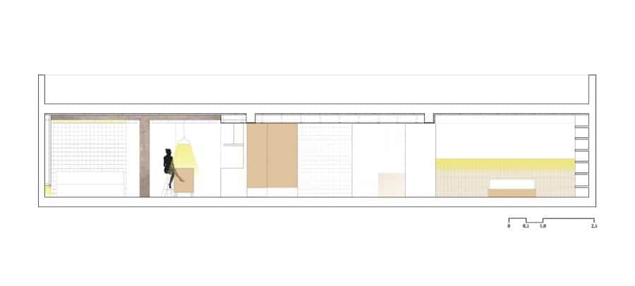 Through the corridor, a weak golden light follows you, creating an atmosphere between light and dark that envelops the bedroom. The bathroom is open to the corridor, so they both benefit from the other. The furniture that was larder in the kitchen becomes a wardrobe here. Wooden blinds hide the clothes and the path to the bath, making the house tidy.