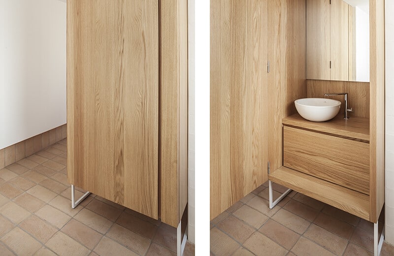 One step forward, there’s a curious device, called “aiguamans” by my grandmother; a new-ancient furniture that hides the washbasin and generates some privacy. Its materials are kind to the white ceramic, the clay and the whitewashed walls.