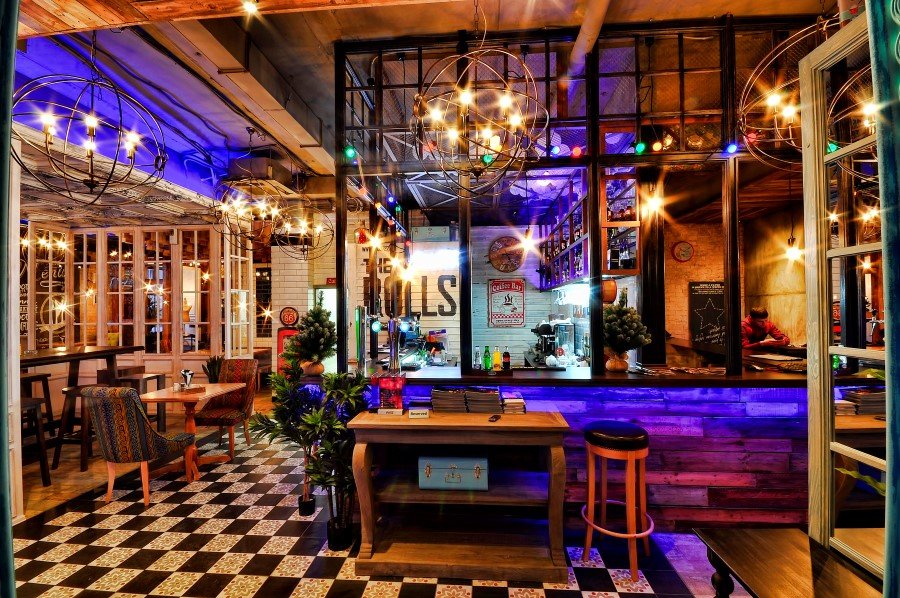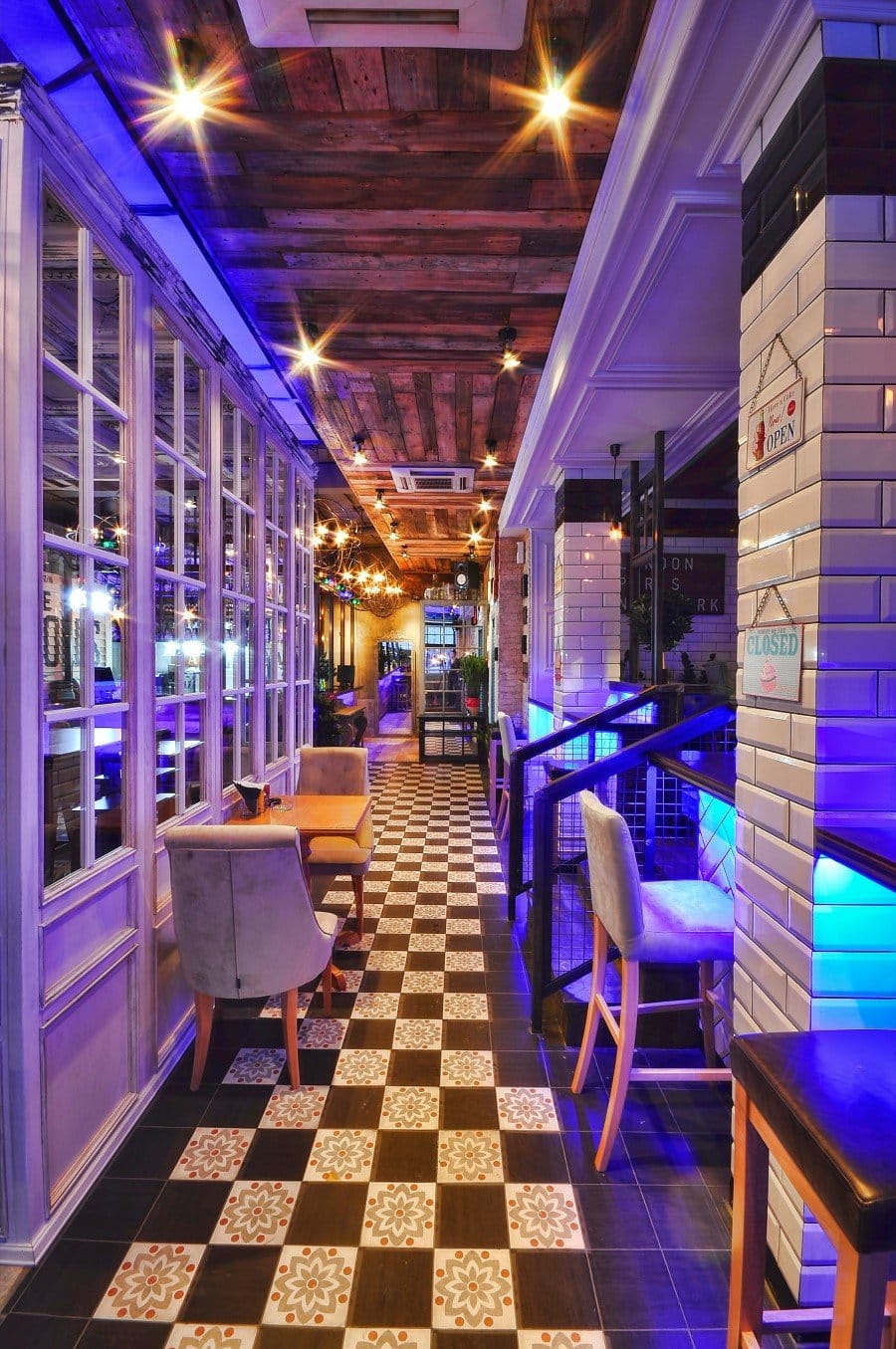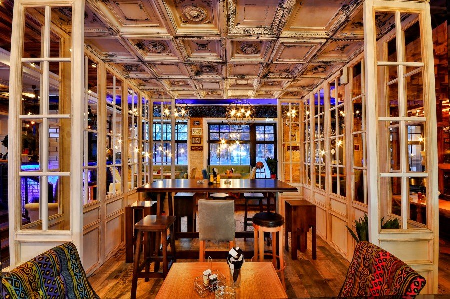 120 sq m area is split into several zones, and all areas are united by colors and textures. Unique ceiling styles, reclaimed wood, striking lighting fixtures, comfy upholstered furniture in bright and light-weight neutral colors, inventive wall decorating ideas and lots of glass components flip these spaces into this wonderful, inviting and classy espresso store.