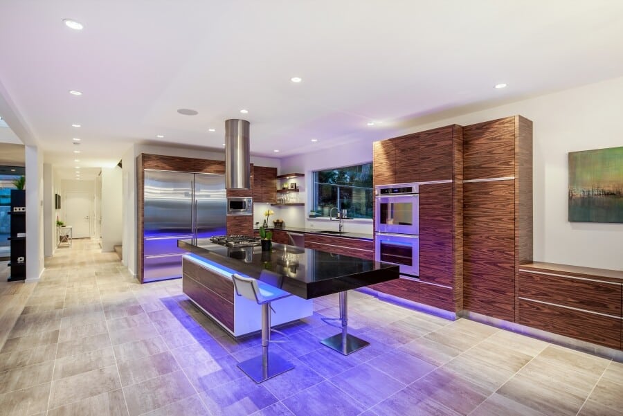 The modern kitchen creates a statement with custom wood cabinetry, granite countertops, top of the line stainless steel appliances and a chic Dacor gas range with Faber hood fan; a platform for entertaining or intimate dining. A glass encased wine cellar and fully wired media room bring additional luxury.