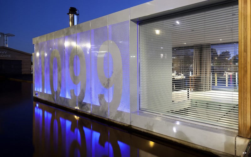 In order to give depth to the facade on the quay side there is a subtle pattern of holes in the façade. By defining where not to punch a hole in the aluminium panel the house number appears. During the day the holes are dark dots whilst in the dark the holes are lit by a large LED strip that is placed behind the facade. In the evening the watervilla transforms itself into a “Star Wars-like” creation.