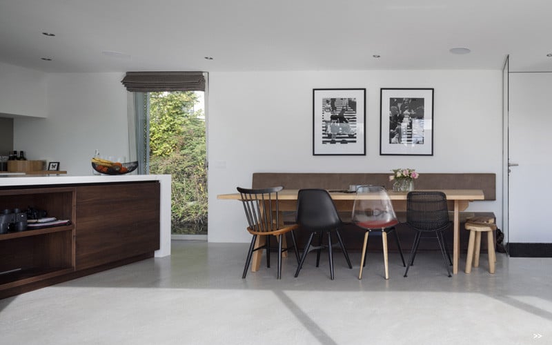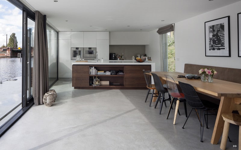 In this watervilla the largest glass sliding doors were placed on the waterside making a great unobstructed view possible on the Amstel from the living area and kitchen. To enlarge the interaction with the outside and the water a floating terrace is moored along the entire length of the villa. The floor is extended from the inside to the outside not only having the same colour but also the same height. This does not only makes the living area feel larger but also gives the glass façade a nice framework when seen from the water. The almost absence of a physical barrier between the living area and the terrace invites people to take a refreshing dive into the river Amstel.