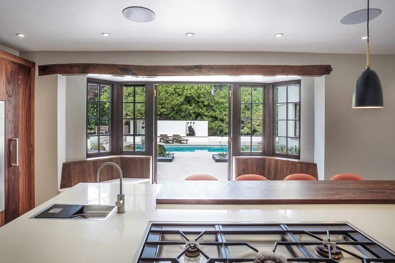 Augmenting the refurbishment of the ground floor rooms was a landscape strategy to open up the spaces to create a seamless link from inside to outside. The landscape design utilises a natural pallet of materials to compliment the house and includes an impressive external swimming pool.