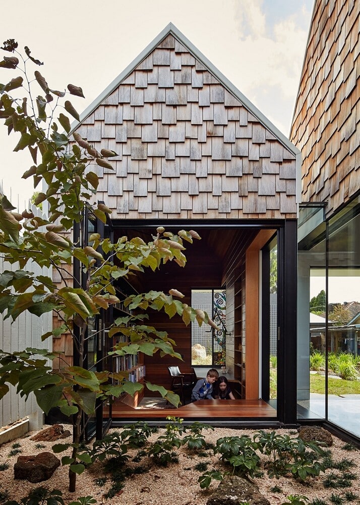 As homes increase in size they increasingly appear as hostile monoliths. When a home is extended, often the monolith crashes into the original. The later looking like an alien cancerous growth on the former. Tower House is anti-monolith. Tower House is village externally and a home internally. The weatherboard house defies logic as the exterior appears to be a series of small structures, while internally the spaces and functions are large and connected. Like the Tardis, it’s small on the outside and large internally.